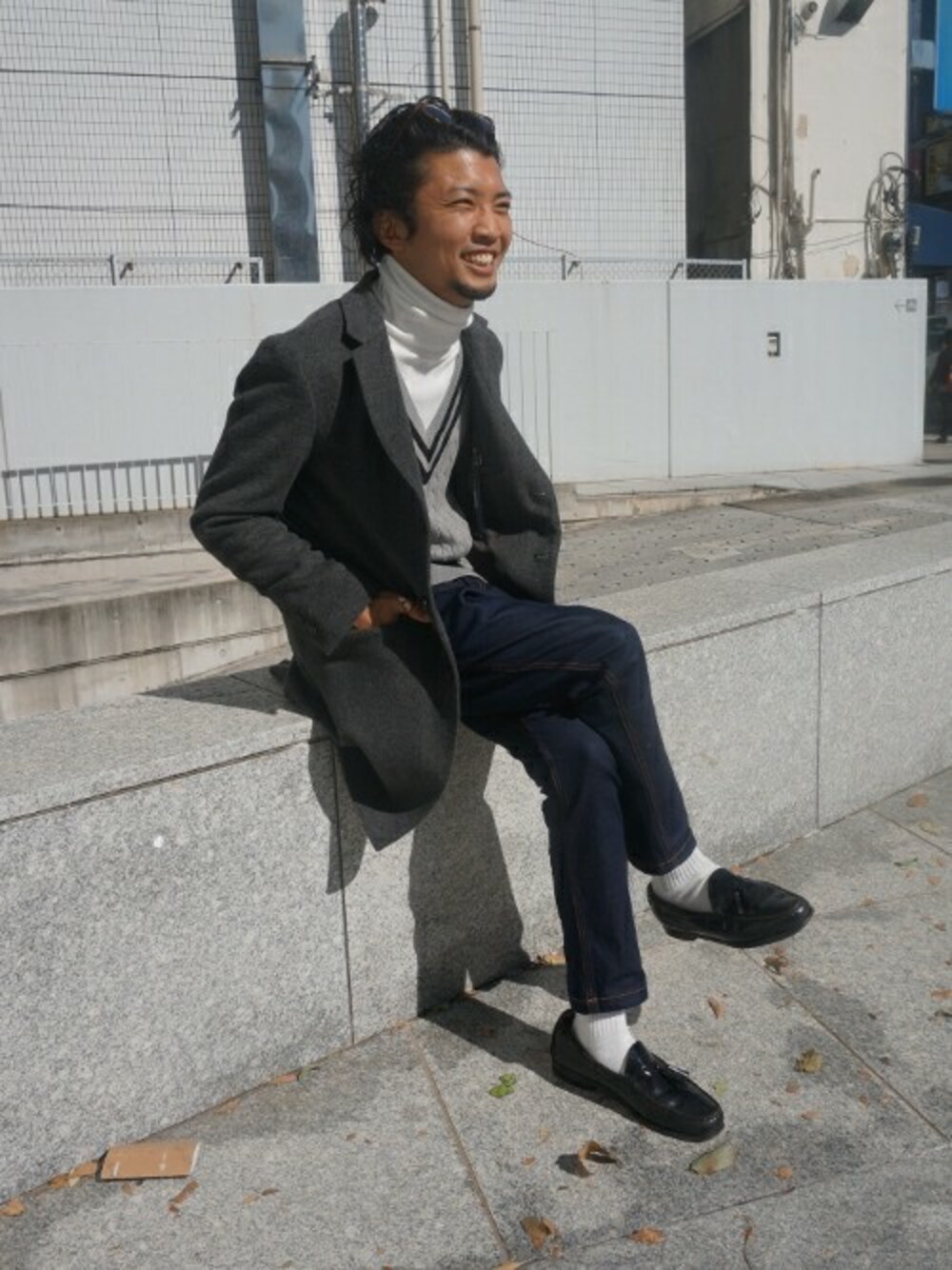 今期注目のチェスターコートにタートルを合わせたトレンドスタイル。