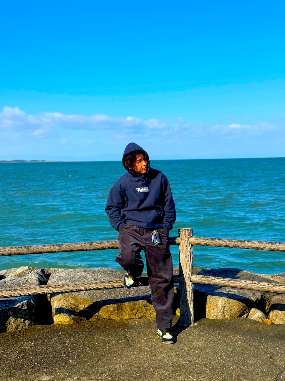 パーカーとスニーカーをsupremeで合わせ、パンツを淡いブラックのコーデュロイパンツにすることで、コーデ全体をまとめています!
