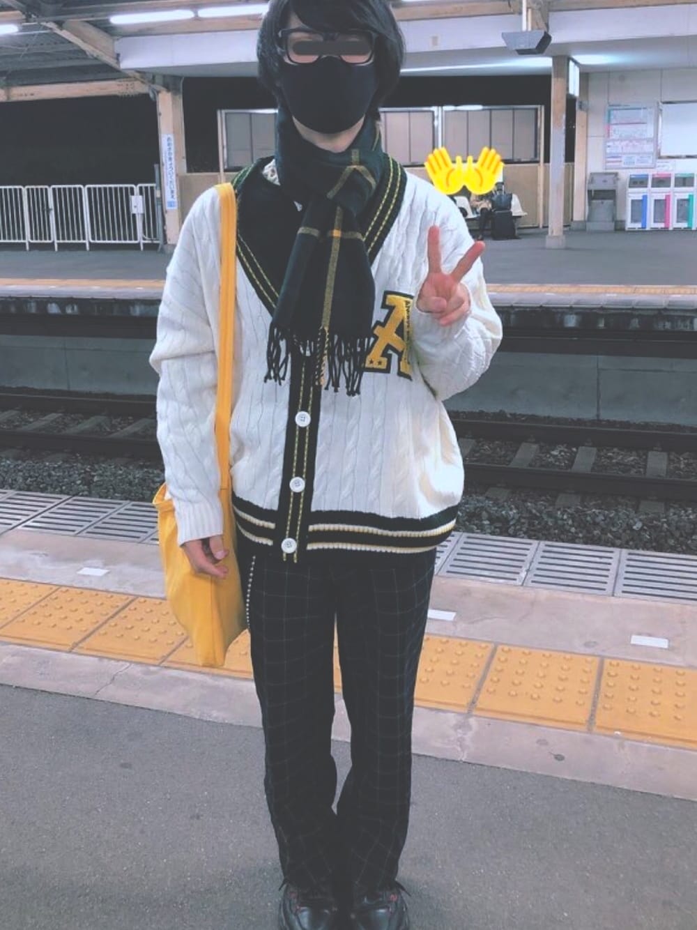 カーディガンから色を拾ってコーデに散りばめました。 黄×緑です、妙にハリポタ感あります。