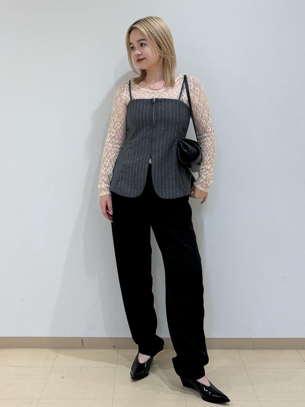 今回は、ウールmixシリーズのキャミソールを使ったコーディネートのご紹介です。 パンツとジャケットとセットで着るのももちろん可愛いですが、バラバラでもいろんなものと組み合わせて着用が可能なので着回し力抜群かアイテムです。 素材が温かみのあるウールなのでインナーはあえて、レーストップスを合わせました。 カラーも抜け感がでるようにベージュを選びました。 他のアイテムはブラックやグレーで統一感が出るようにしました。 LINEで名古屋タカシマヤゲートタワーモールスタッフに相談は【友達だち追加】をタップをして下さい <a href="https://lin.ee/16rd1tF" style="background:url(https://scdn.line-apps.com/n/line_add_friends/btn/ja.png); background-size: contain; display: block;width: 116px;height: 36px; margin:.5em 0;"></a> お気に入りのスタイリングやスタッフは是非♡ボタンでお気に入り追加をお願い致します。 【お気に入り】タブから一覧でご覧頂けます。