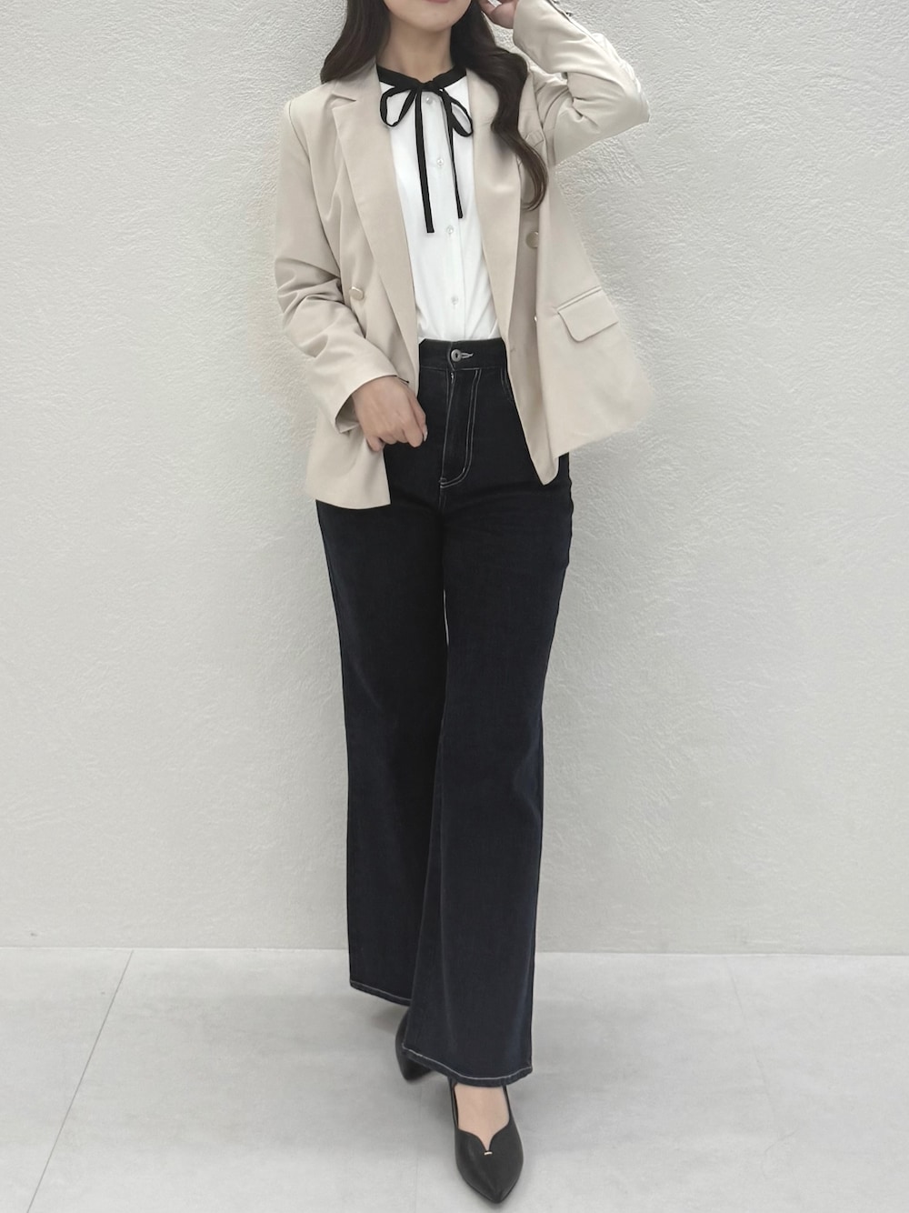 ** ** ** ** point ** ** ** ** 主張しすぎないボウタイブラウスで シンプルな大人フェミニンコーデ。 ジャケット+デニムパンツ合わせで きっちりしすぎず、プライベートやオフィスにも万能♪ [ thank you for watching ] いいねやお気に入り、 フォローもぜひお待ちしております🧸🌿 InstagramやTik Tokもぜひチェック♡ @mischmasch_official