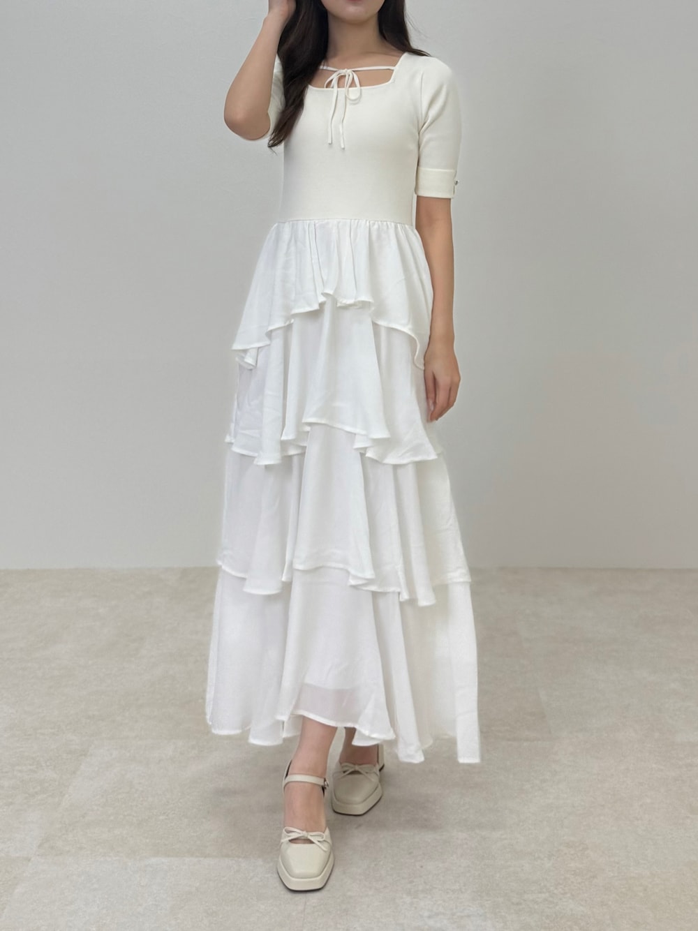 MISCHMASCH EC(アパレル本部)のワンピース「2026春夏新作 ZOZO限定アイテム フロントリボンティアードフリルロングワンピース」を使ったコーディネート