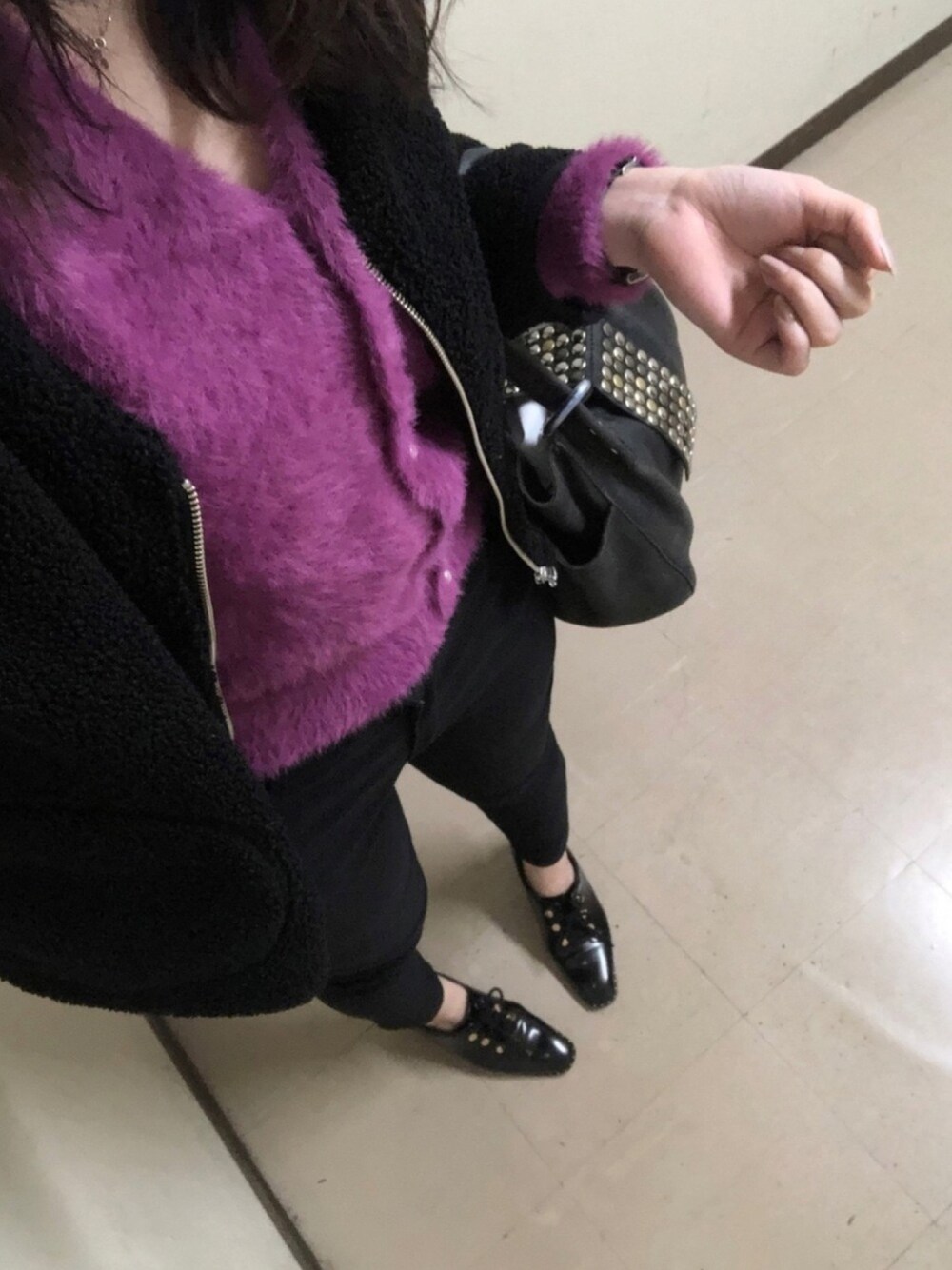 この前の通勤コーデ(ö) シャギーニットカーディガンが かわいい… タイヤ交換したら、ホイール汚くて 早く磨きたい…