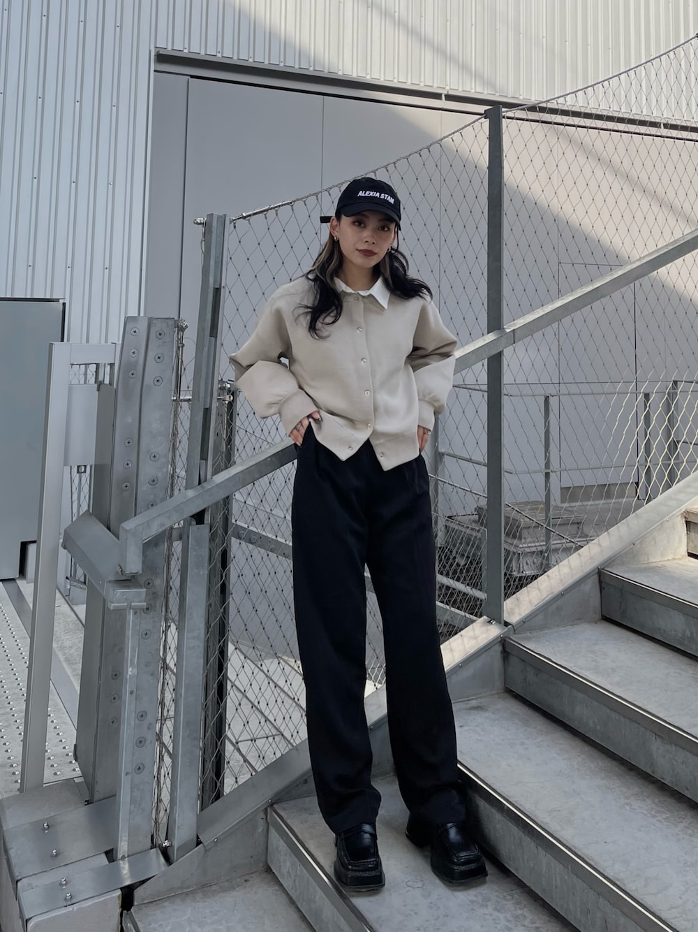 モノトーンコーデ🖤 リングボタンのニットに襟付きシャツのレイヤードでトレンド感を✨ もちっとした生地感が心地よいニットで毛玉にならないのも🙆🏻♀️❤️ サラッとした素材のパンツを合わせて綺麗めなコーデに キャップでカジュアルに落として着るのが可愛い✌🏻 instagram @honoka__echigo