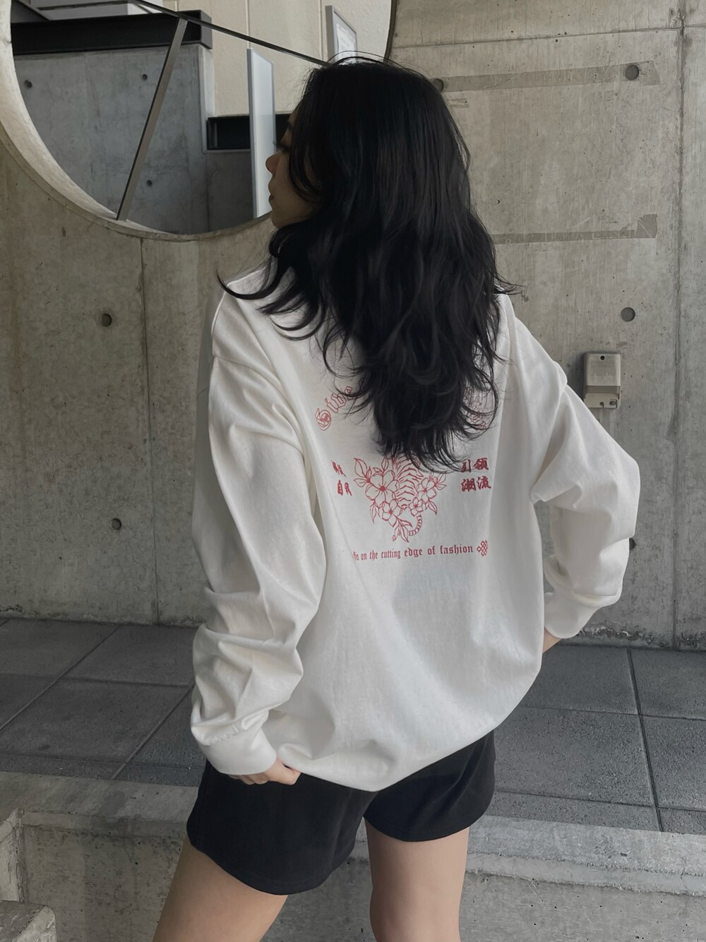 CHINAモチーフロンTEEのホワイトver🤍 白に赤字が可愛くてデザイン映えて好き🔥 腕周りのたゆっとしたルーズ感も可愛いし 袖はリブできゅっとしてるので袖がだぼだぼならないのも👌🏻 秋から春、夏手前までサラッと着れるのでおススメです⭐️ instagram @honoka__echigo