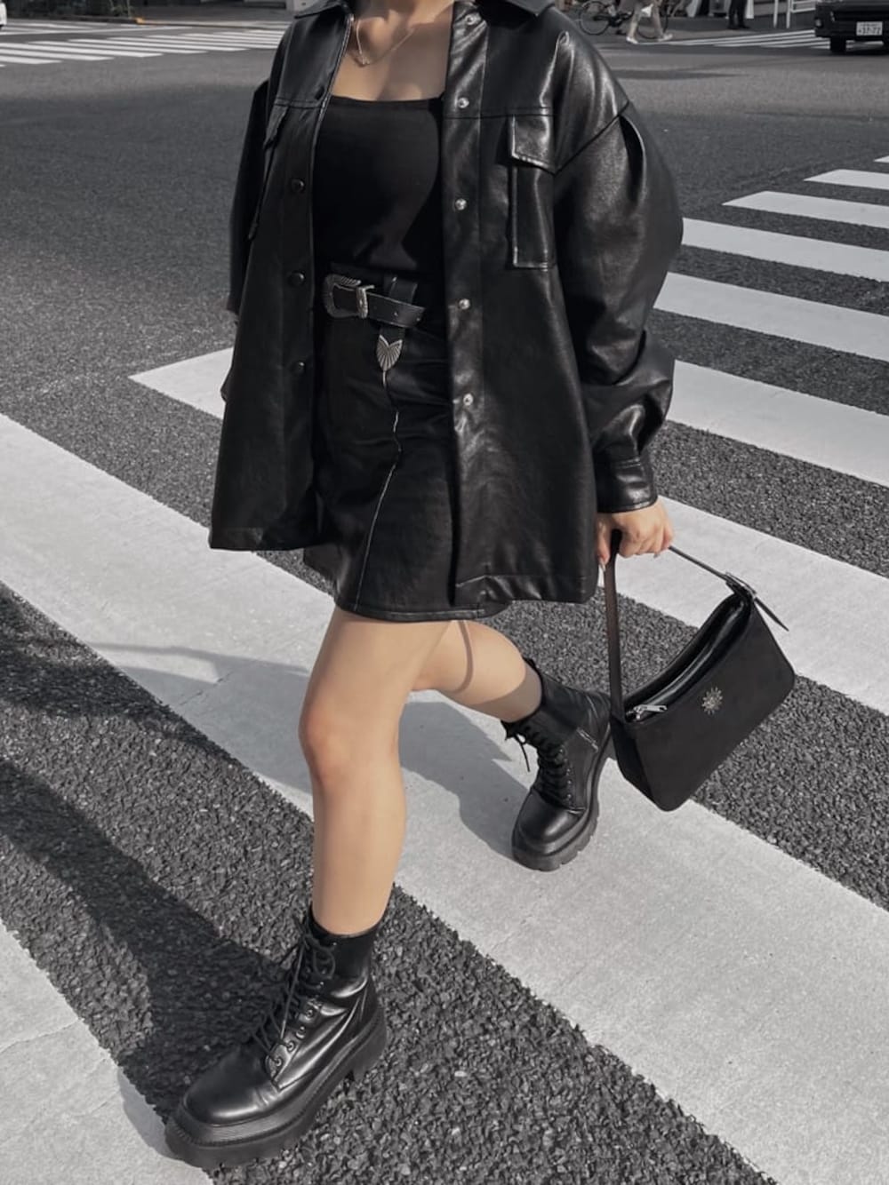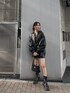 オールブラックコーデ❤︎ いつになっても飽きない定番のブラックコーデ。 レザーのセットアップでカッコいいスタイリッシュな印象に✴︎ ボリューム感のあるジャケットにミニスカートのバランスが絶妙でかわいい♪ 意外と重たくないので羽織りやすいジャケットで、お尻周りもすっぽりカバーしてくれるサイズ感が◎ フェイクレザーなので柔らかくて着やすいですよ☺︎ セットアップのミニスカートはインナーパンツもしっかり入ってるので安心✳︎ ウエストがキュッと締まっていて少し台形の形なので太もも部分に隙間が出来る事でより脚も細見えします。 縦ラインが入っていて1枚でもデザイン性しっかりあるのでセットアップ以外でも着回しきくのでレザースカートを探してる方にもおすすめ○ ミニなのでごつめのブーツ合わせで敢えて重ためで、バックは異素材のスウェード生地を合わせる事で一気に上級者コーデに♡