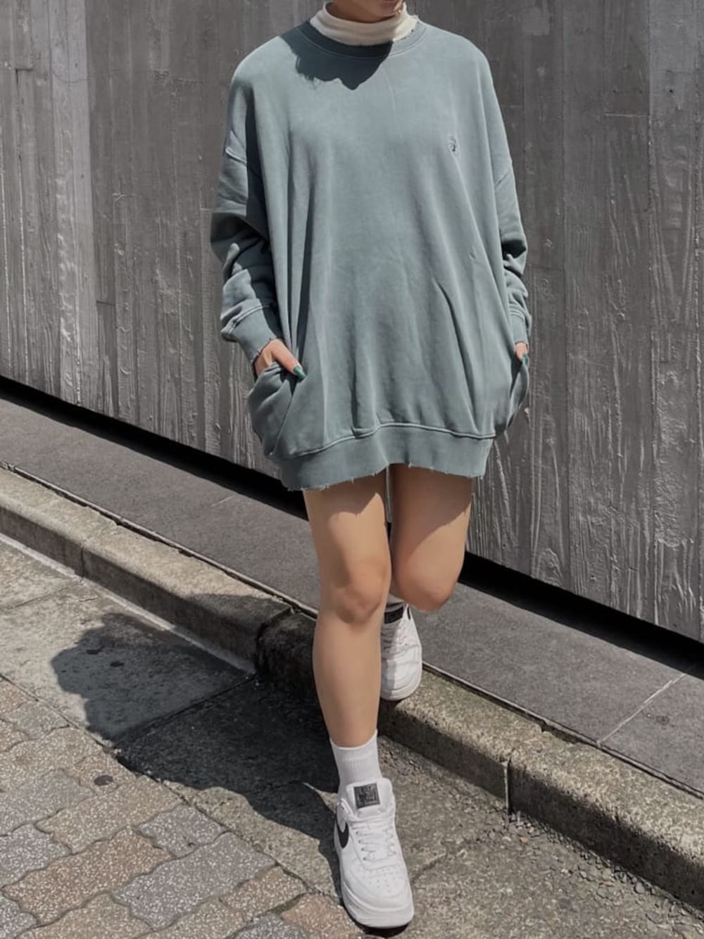 大人気のサニーちゃんのスウェット✴︎ 店舗でも人気なGRNをチョイス。ハイネックのインナーと合わせたレイヤードスタイルでスニーカーを履いてカジュアルに♪ オーバーサイズでゆったりとしたシルエットが可愛くて150cm-165cmくらいまではワンピース風で着れます☺︎ ポケットが付いてるのも助かるポイント◎ サニーモチーフの刺繍は同色なのでさりげなくワンポイントで使いやすいです‼︎ 色味がとにかく可愛くて絶妙なので他とも被らないです✔︎ インナーはロールアップタックショートパンツを。 嵩張らずにコンパクトなサイズ感なのでインナー使いもしやすくて形も綺麗でおすすめです⭐︎