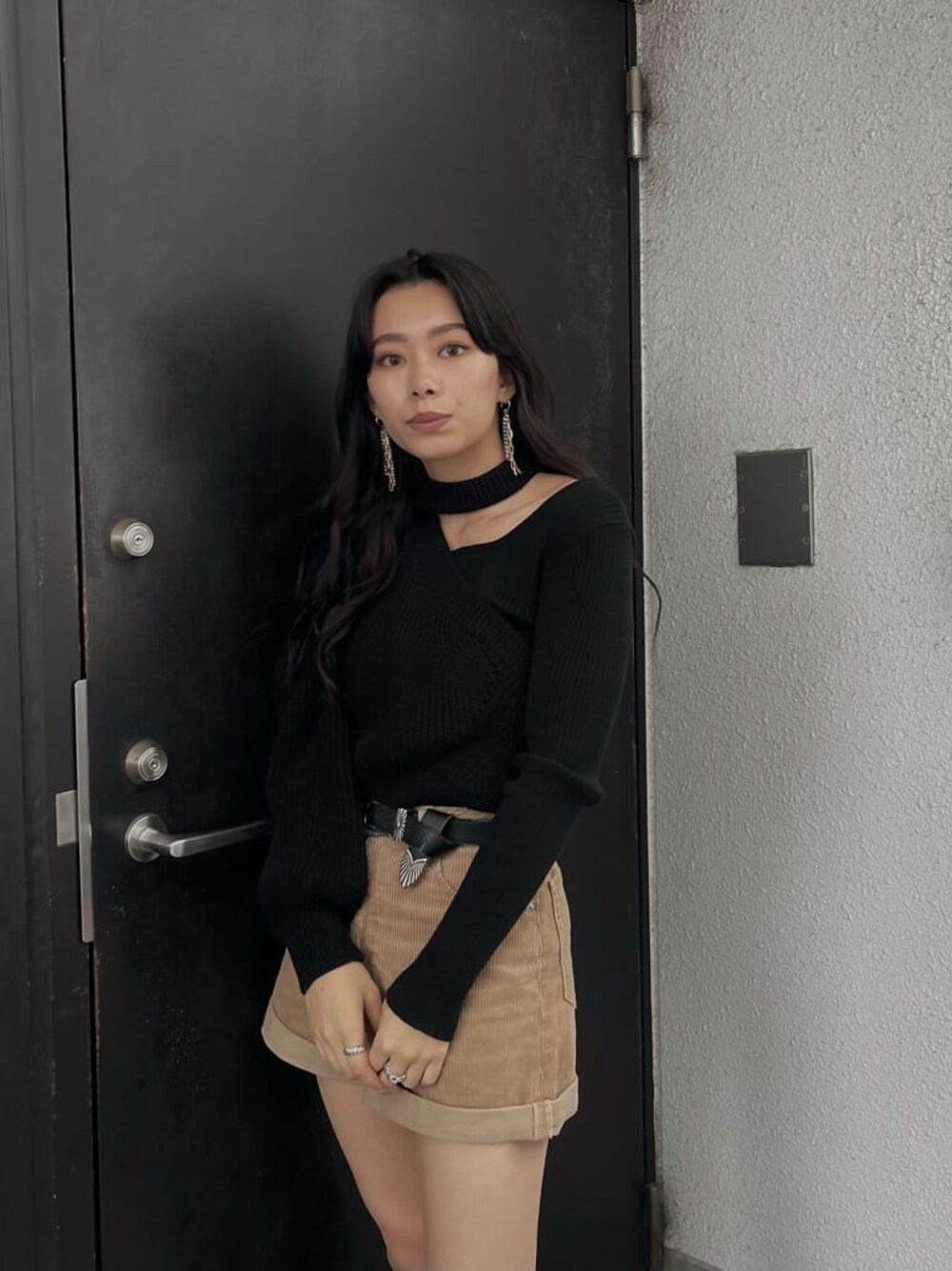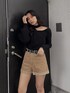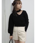 デコルテにカッティングが入っているニット✔︎ デザインニットなので1枚で可愛いが作れます☺︎ 袖が左右非対称になっていて、右はボリューム袖で左はピタッとしたシルエットでアシンメトリーなデザインも◎ トップスはブラックでボトムスがコーデュロイ素材なので重たくなりすぎないようにベージュを合わせました。 ショートパンツはウエストが細身で作られていてぴったりしたサイズ感で着るのが可愛い❤︎ 裾はロールアップになっているので裾広いシルエットでより細見え効果も抜群です♪