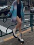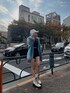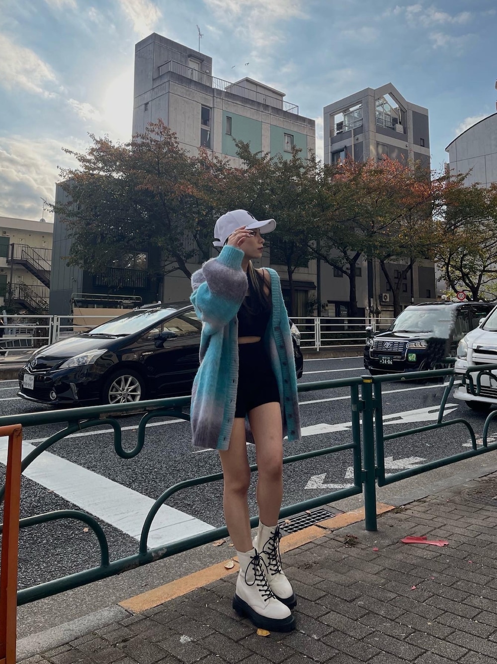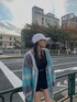 グラデーションカーディガンの新色BLU💠 インナーはシンプルにブラックでまとめて小物はホワイトでアクセントを加えました🫶🏻 カーディガンのボタンを閉めてワンピース風に着るのも可愛いです🦋