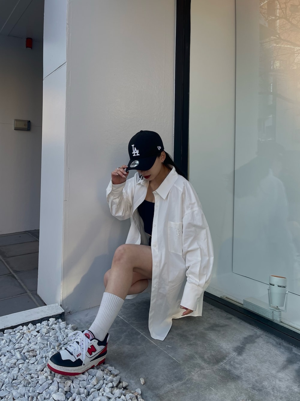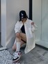 海外風シャツコーデ👔 春夏に必須アイテムのシャツはマストハブ‼︎ BASICな形なので着回し抜群でワンピ風やトップス、インナーとしても使える万能アイテムです🤍 胸元にワンポイントの刺繍も可愛いです💕 海外風に長めのソックスにカラースニーカーでキャップを合わせてみました👟