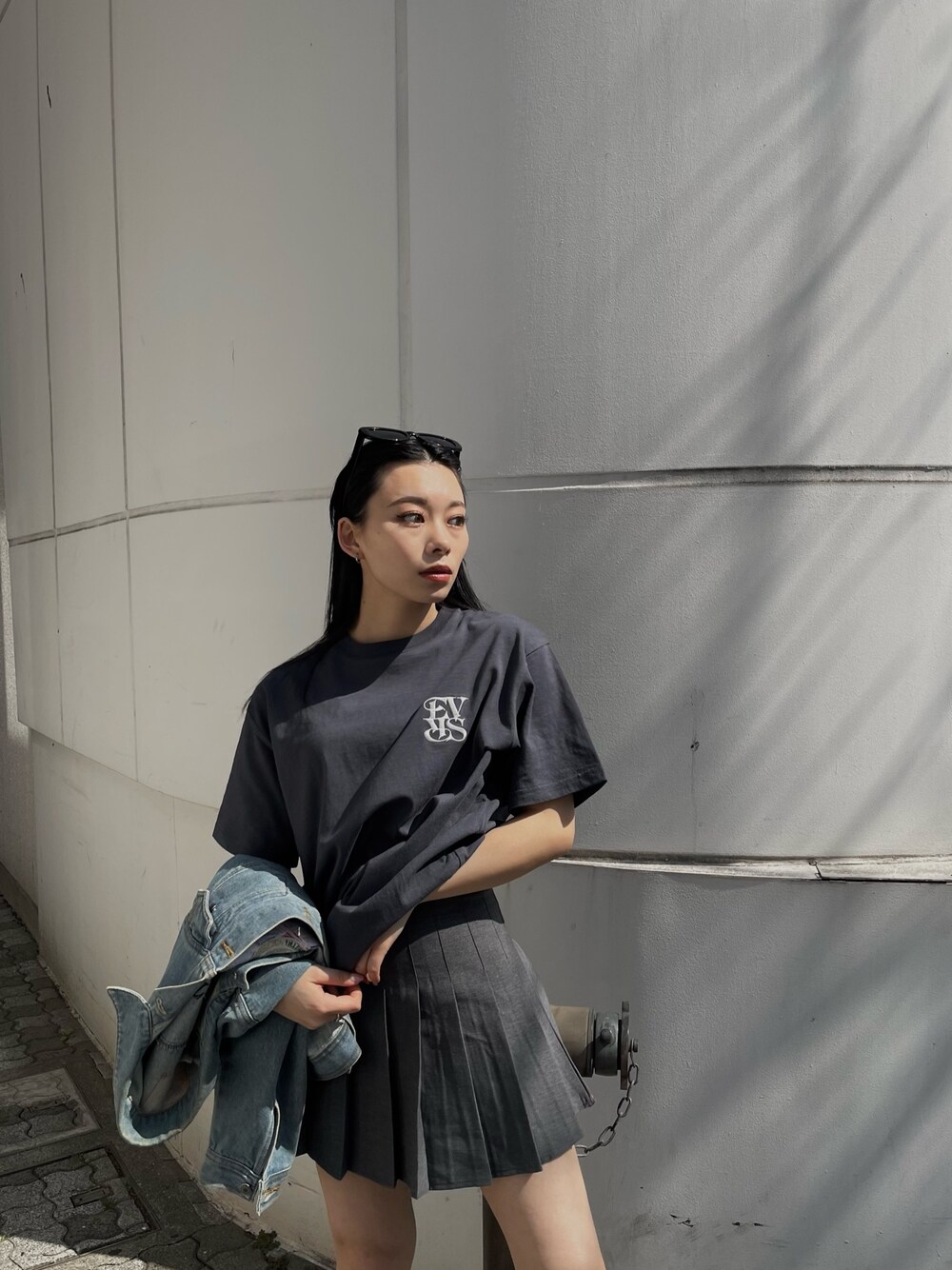 海外ガールの春のTシャツコーデ👕 プリーツスカートを合わせてトレンド感を🎶 TシャツはBLKのカラーでもくすみネイビーグレーで真っ黒ではないので春先、夏も使いやすく抜け感があって可愛い🩶 羽織にはデニムジャケットで春感を☘️ Tシャツは腕周りがゆとりあって腕も華奢見えしてくれて、丈感も長過ぎないのでトップスでインしても使いやすい丈です🔗