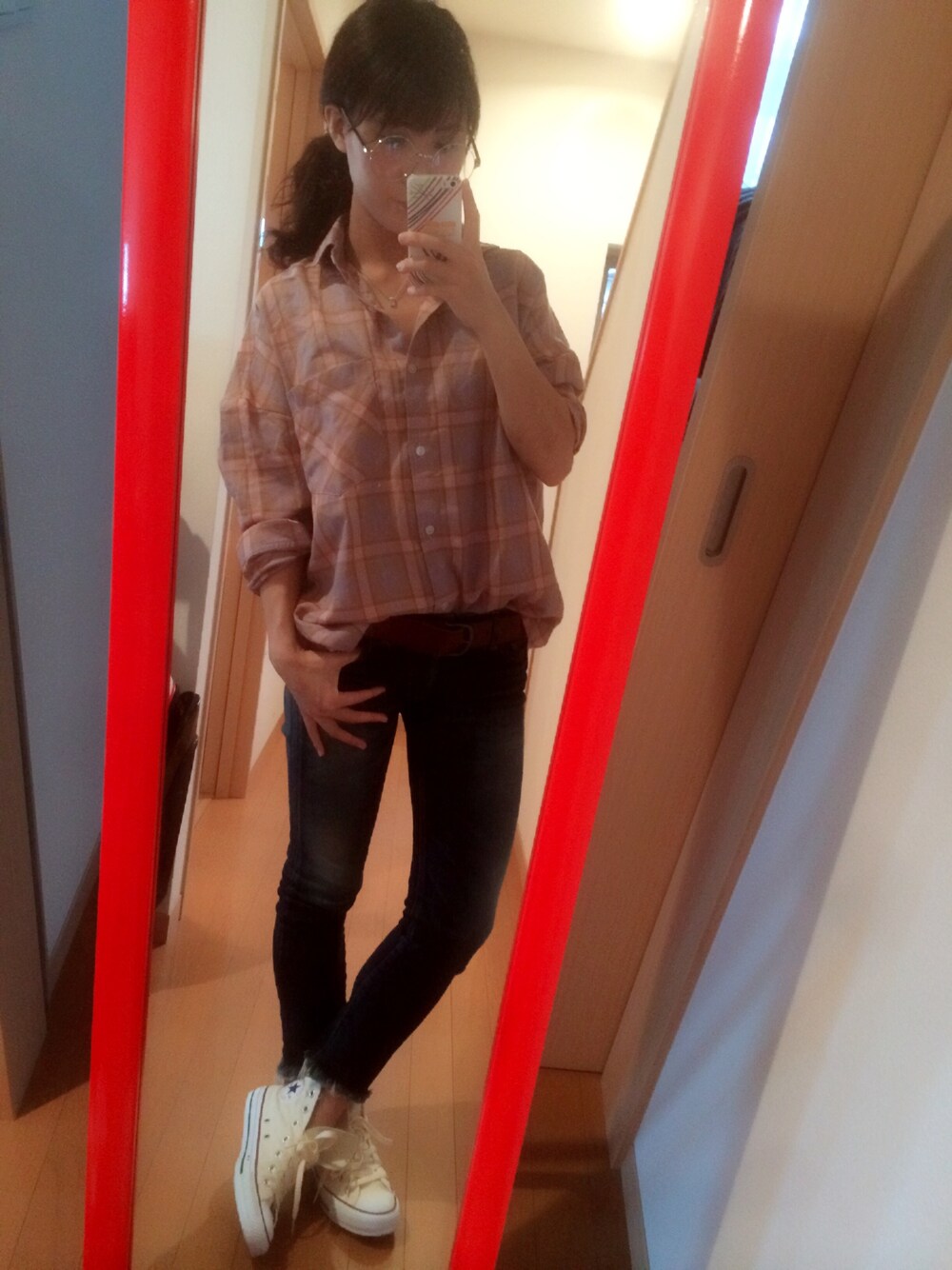 メンズライクでラフだけど、ピンクとブラウンのシャツで女らしく💓