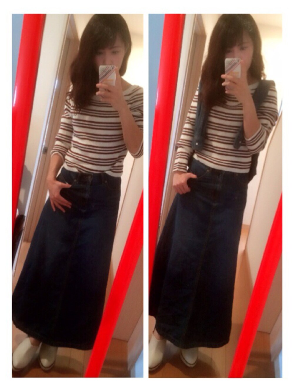 プチプラデニムコーデ👍 肩がけデニムシャツとデニムロングスカートで統一感だしてみました🙆