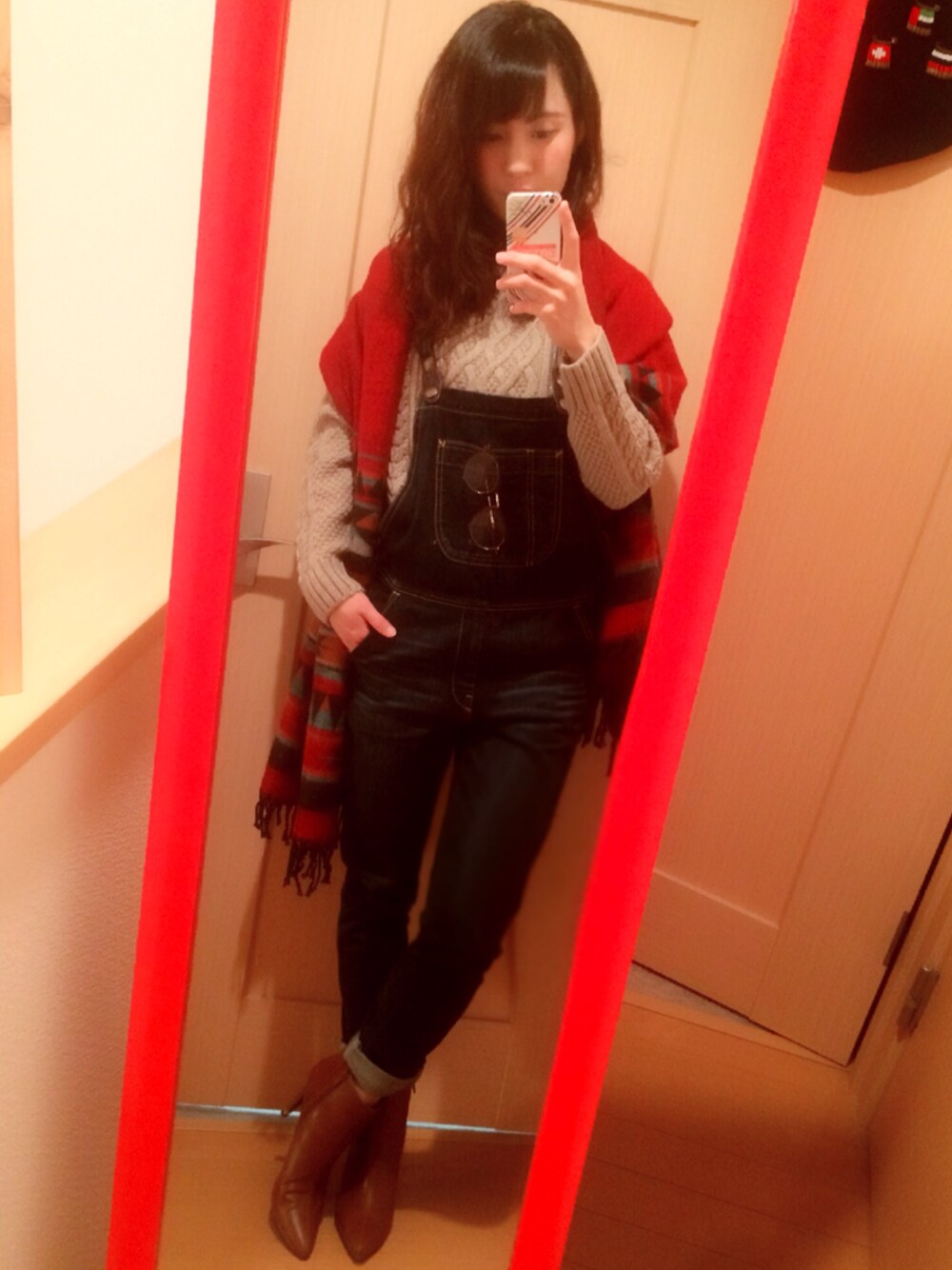 友達と飲みに💓 ニットとサロペだけだと色的にすっきりしすぎだからちょっと派手めのストールを😊 写真よりボルドーに近い色👍
