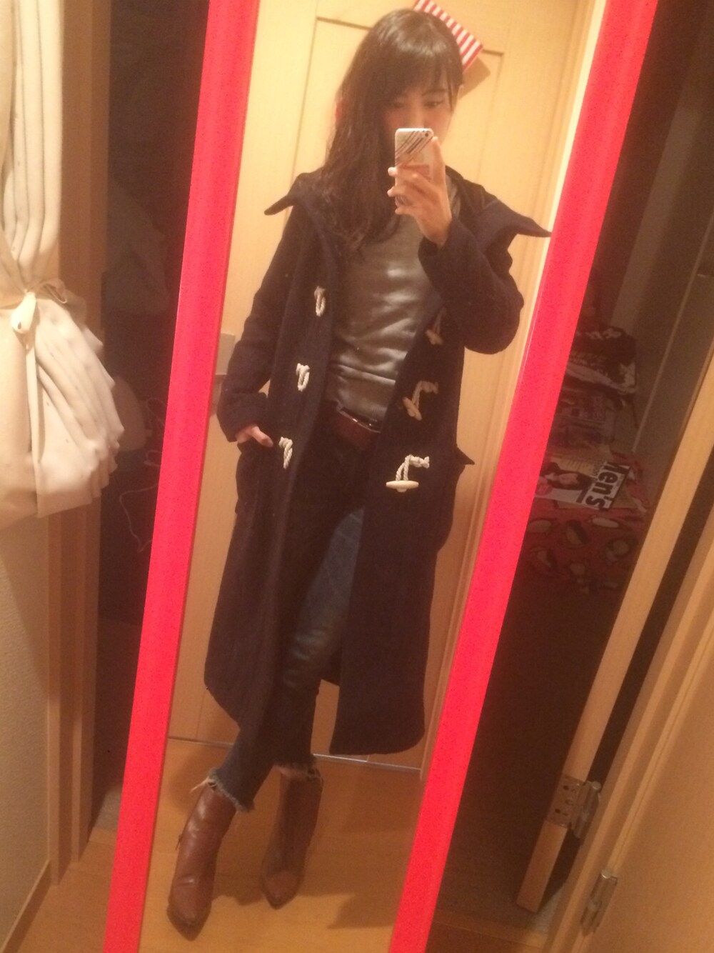 フード付きロングダッフルコートだから、インナーはすっきりと💕