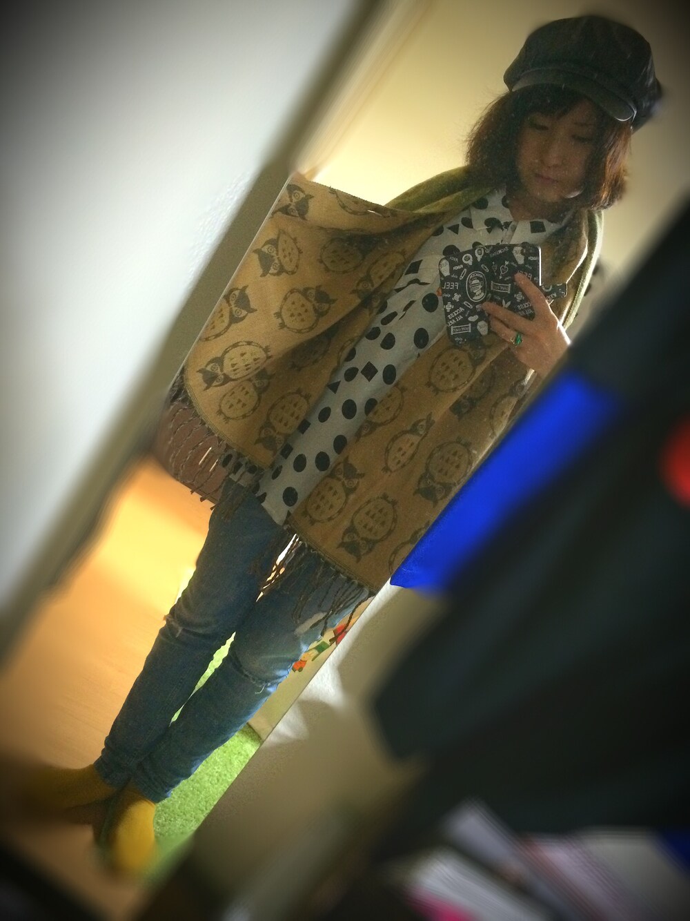 シャツ…古着 (下北沢 スキニー…H&M ストール…親友ちゃんからのP. フクロウ柄のストール♡ 福ふくろーう!! 今日は一段とさむかたね☔️⛄️🍃