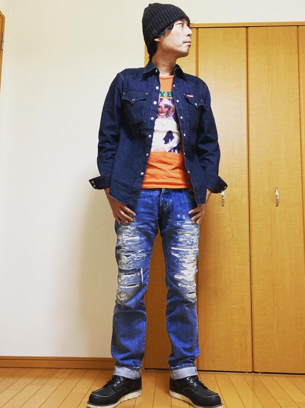 デニムオンデニムな、アメカジコーデです。 このくらい濃いデニムシャツだと色々使えますね👏