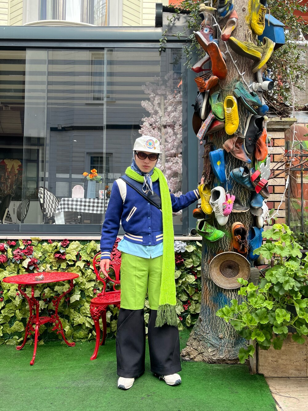 青、水色の服に黄緑を取り入れて、見栄え良くしています。キャップとスニーカーの白が三角形で配置されていて、いい配色だと思います。