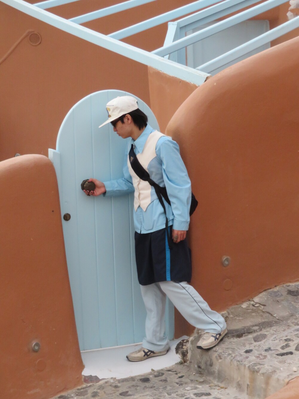 水色と白でコーデを組んでます。