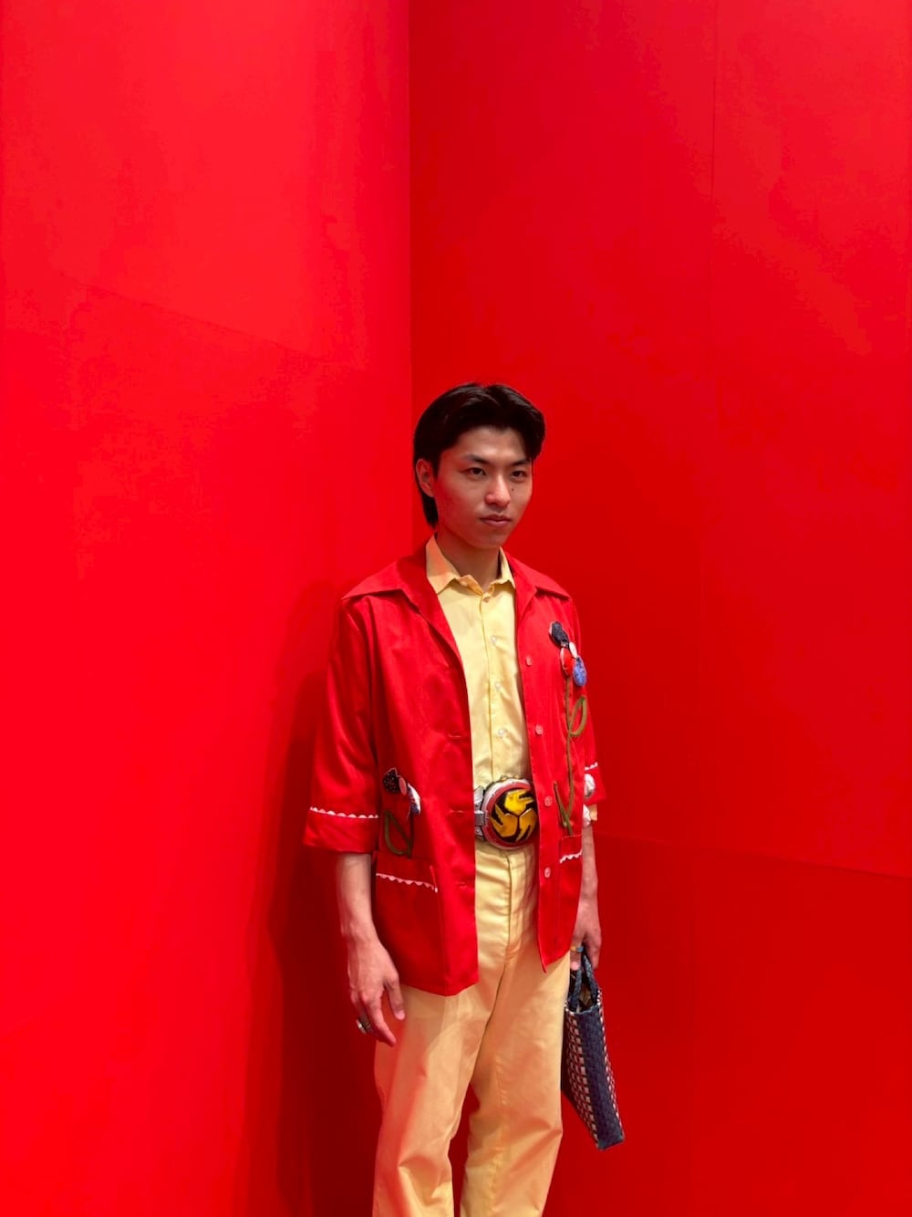 赤のシャツにシンプルに黄色で合わせました!