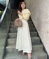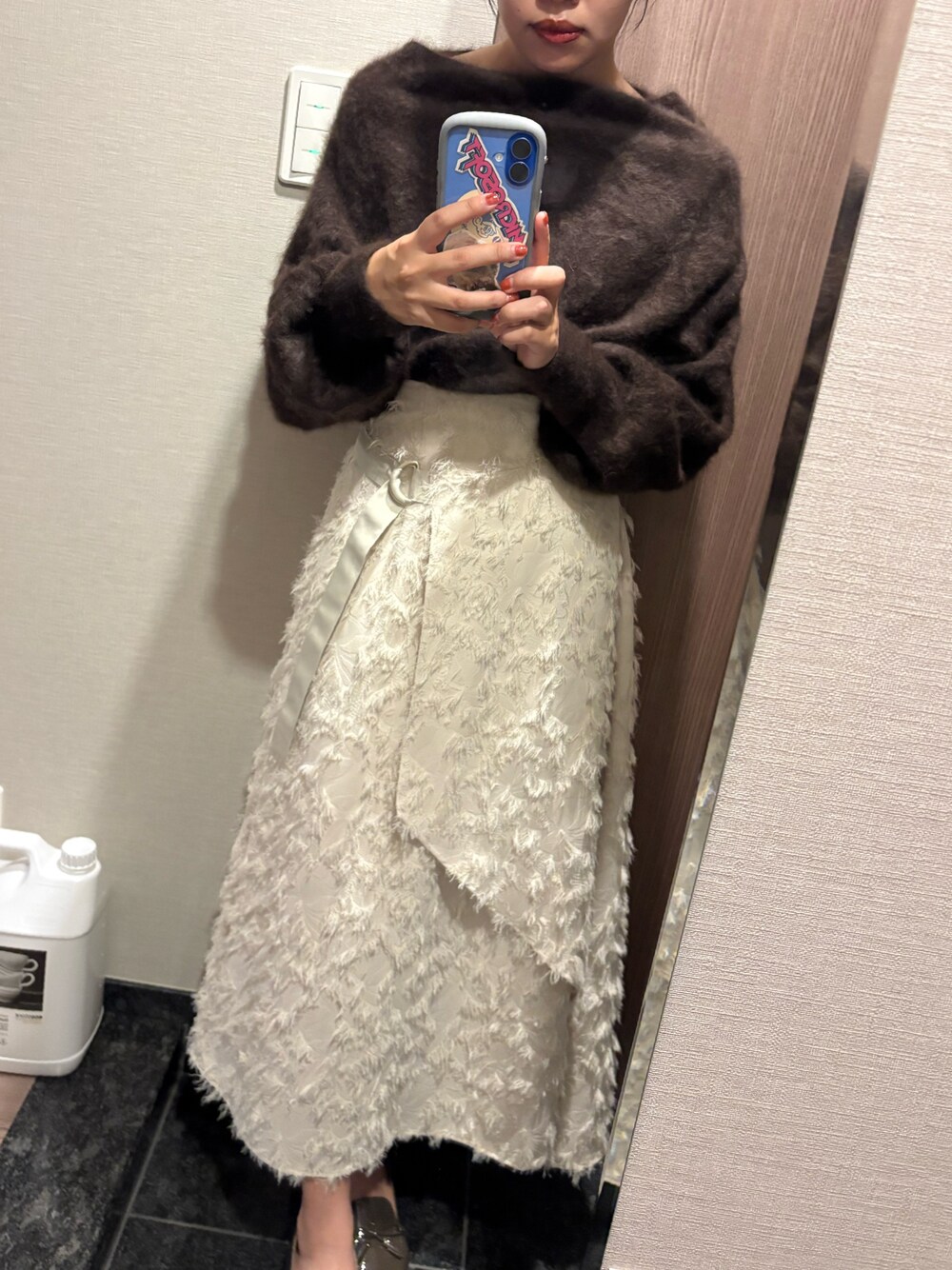 オフショルになるのにこの写真してない、しかもeteのネックレスもつけたこの後 スカート、ラップになっててかわいいのにこれがアイテムで見つからない、、