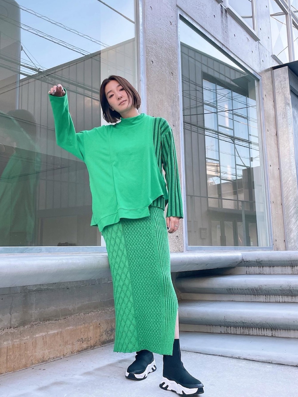 ニットとミニ裏毛をドッキングしたハイネックプルオーバーにニットスカートでセットアップとして着用ております🟢🤍🟩