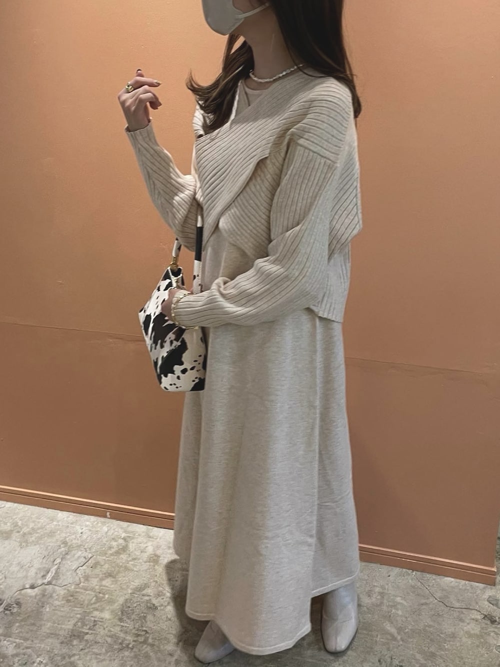 . titivateのクロスデザインニットレイヤードワンピース𓇢 Aラインのワンピースとクロスデザインニットがセットになっていて、別々にも着られるの♪ クロスニットは着丈が短めだからスタイルアップ効果抜群✌🏻 身長156cmでちょうどよかった! 私はアイボリーにしたけど他のカラーも可愛かったです♡