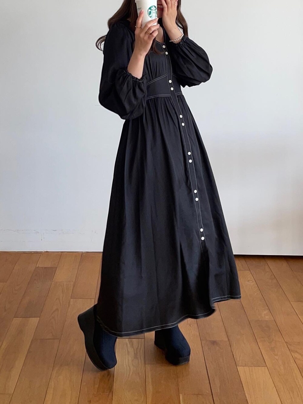 ブラック系のワンピースを着用したレディースの春コーディネートの4枚目の写真