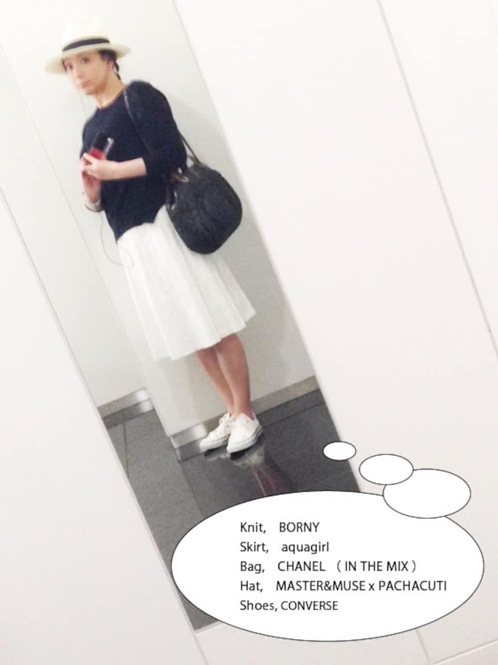 Knit, BORNY Skirt, aquagirl / CROLLA Bag, CHANEL ( IN THE MIX ) Hat, MASTER&MUSE x PACHACUTI Shoes, CONVERSE BORNY( ボルニー )の Navy サマーニットは サイドにスリットみたいのが入ってて ゆったり具合がちょうど良くてお気に入りです♡ ホワイトも持ってます♡ ホワイトのプリーツスカートは、 aquagirl( アクアガール )で購入した CROLLA ( クローラ ) の物♡ 今年、ホワイトのプリーツスカートが aquagirl に、3タイプ??くらい、あったけれど.. 私が購入したコチラは、お腹あたりのプリーツが 広がらないようになってるので比較的スッキリしています♡ あと、この前買った MASTER&MUSE x PACHACUTIの帽子は 爽やかな感じだけれど 色や形が、少し知的に見せてくれる感じも..♡ とてもお気に入り♡