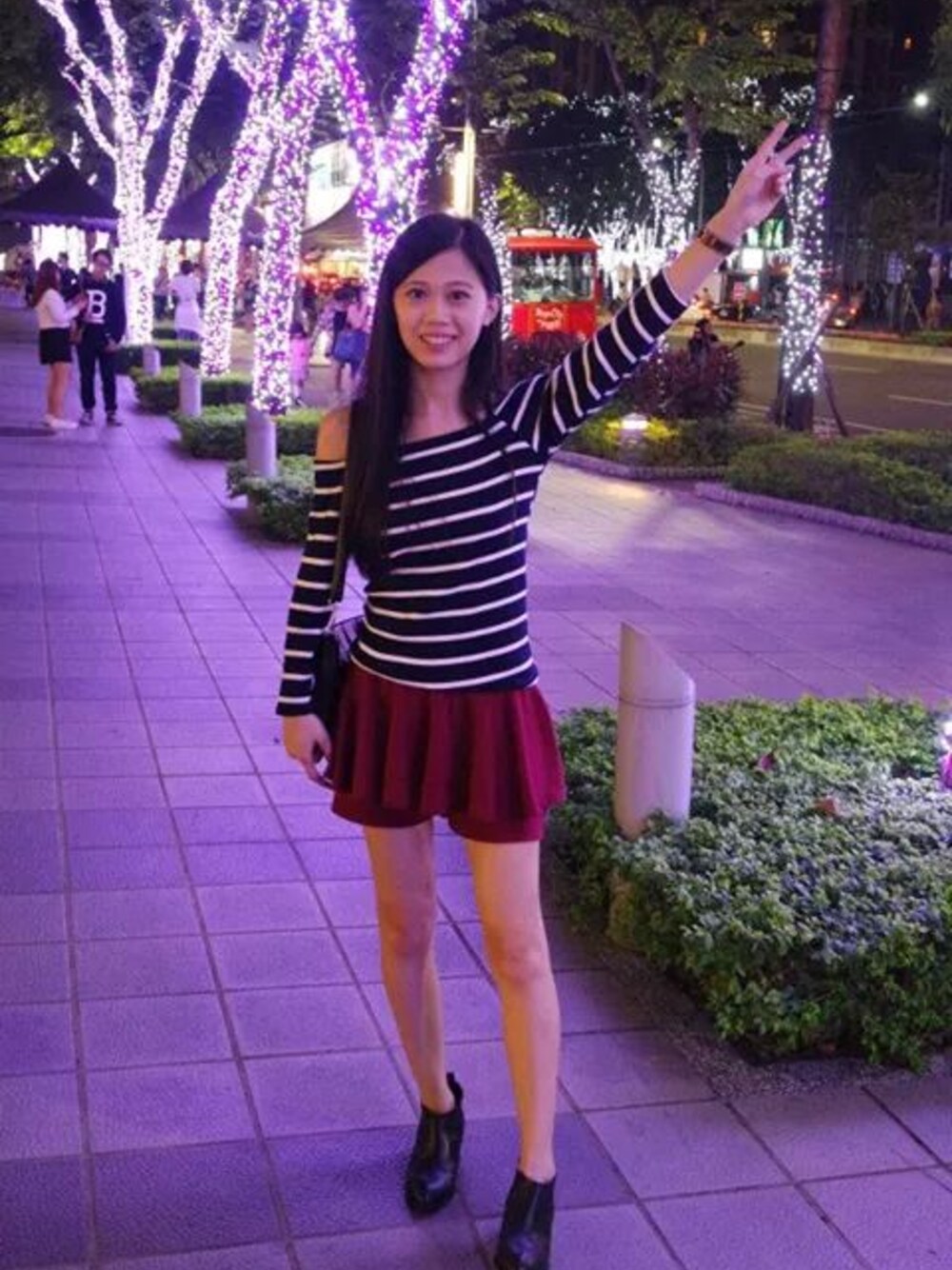 條紋一字領+酒紅色褲裙