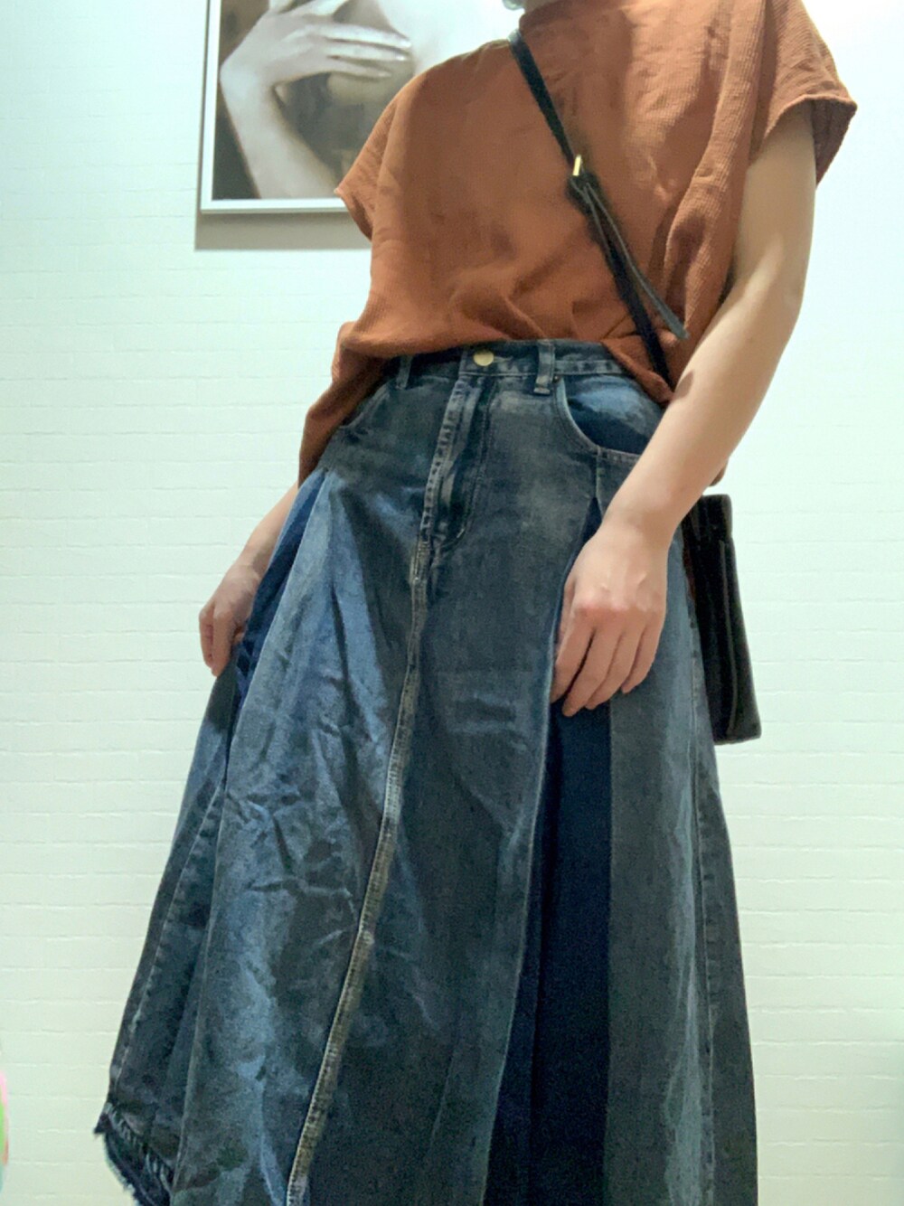 ご覧頂きありがとうございます🙏✨ 立体感のあるデニムスカート✨ オレンジトップスと合わせて 秋口コーデ🍁 いいね・お気に入り登録 よろしくお願い致します🙇♀️❣️