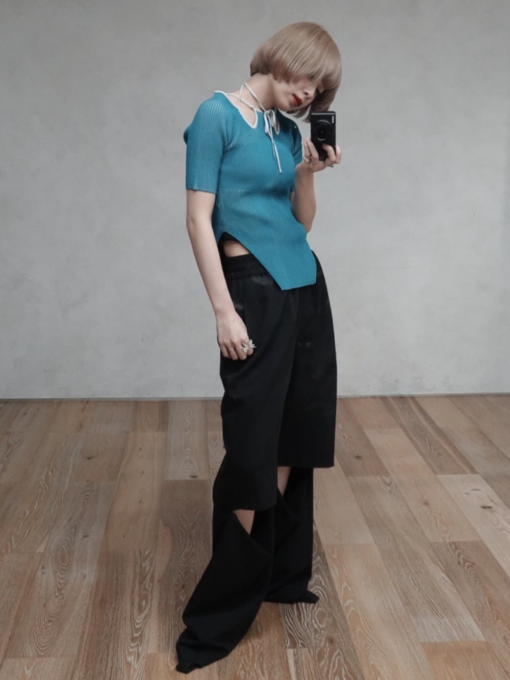 もえか / ecrumのニット/セーター「2way design code neck イレリブ配色トップス」を使ったコーディネート