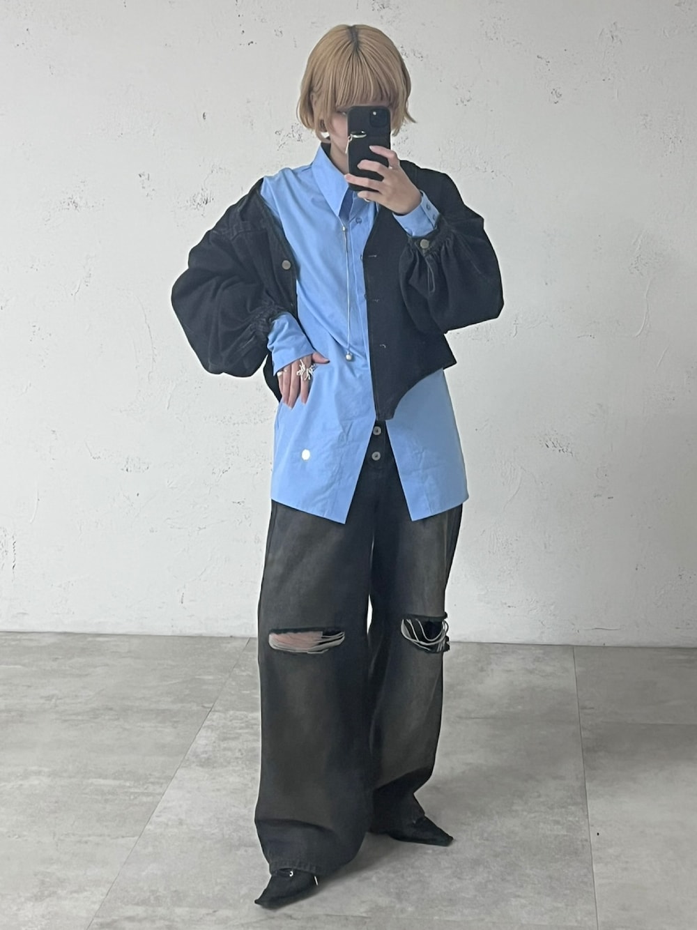 カジュアルコーデの代表アイテム、デニムでまとめたコーデに差し色でブルーシャツを仕込んでみたよ◎ このシャツ㌿𝓶𝓸𝓷𝓮𝔂可愛い、、、