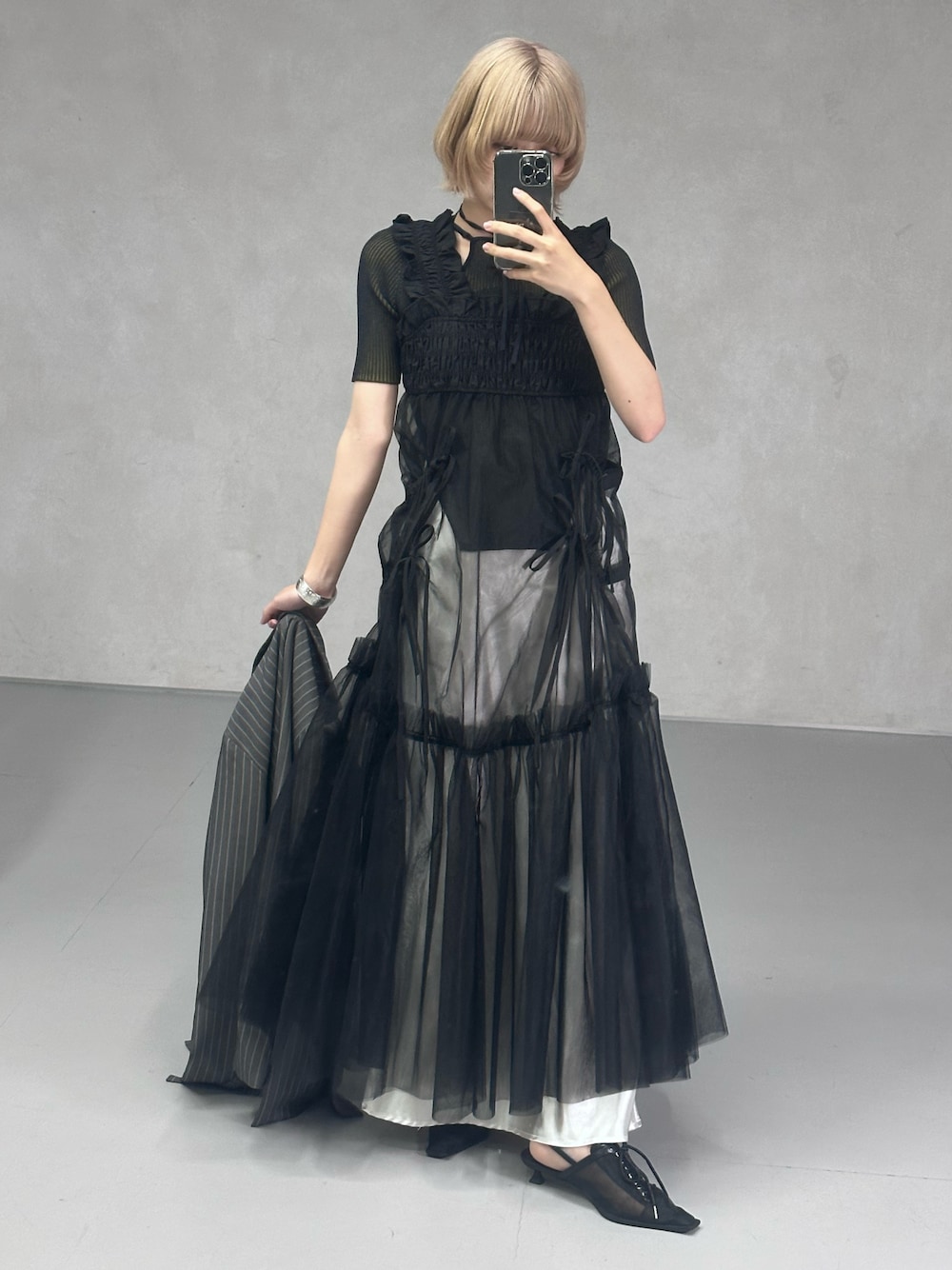 もえか / ecrumのワンピース「Many ribbon ティアードボリュームワンピース」を使ったコーディネート