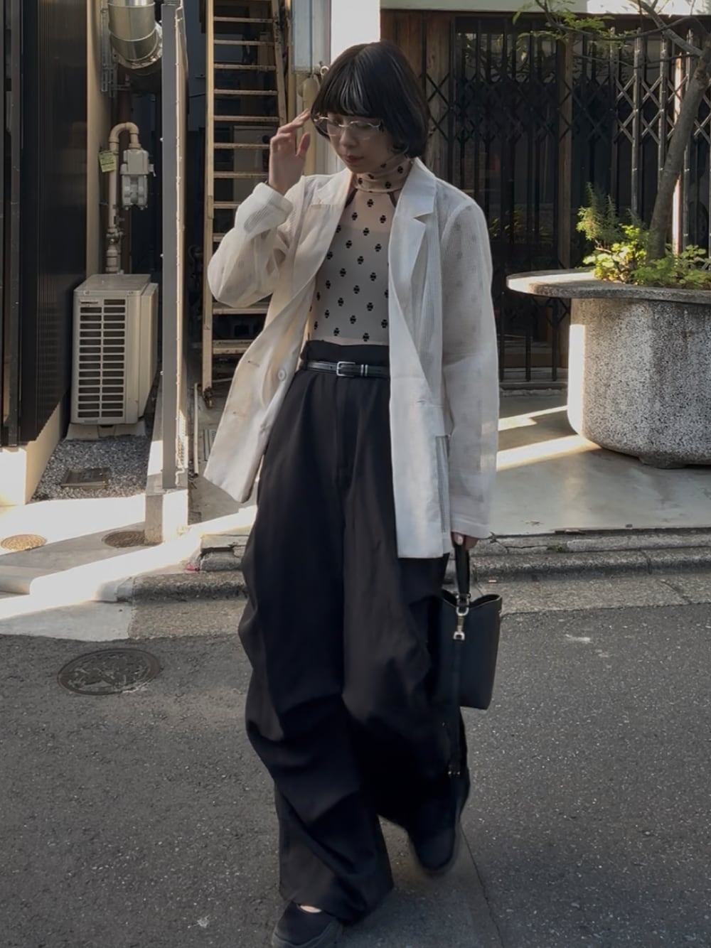 Today's Outfit. ☕️📰🧺 風はあっても、日向は照りつける暑さで 日陰は冷静な涼しさで 全然性格が違うね。 外を歩いてる時は秒単位で汗をかくのに、 電車やお店の中は凍える寒さで、 服装が難しい季節。 そんな時はメッシュや透け感のあるシアー素材のジャケットを1枚持っておくと便利だよ。 ファッションのアクセントにもなるしね。 Jacket / @ray_beams_official Tops/ @sorin__official Pants / @ellnoloset_official bag / @agnesb_officiel 👓 / @tijn_japan @tijneyewear