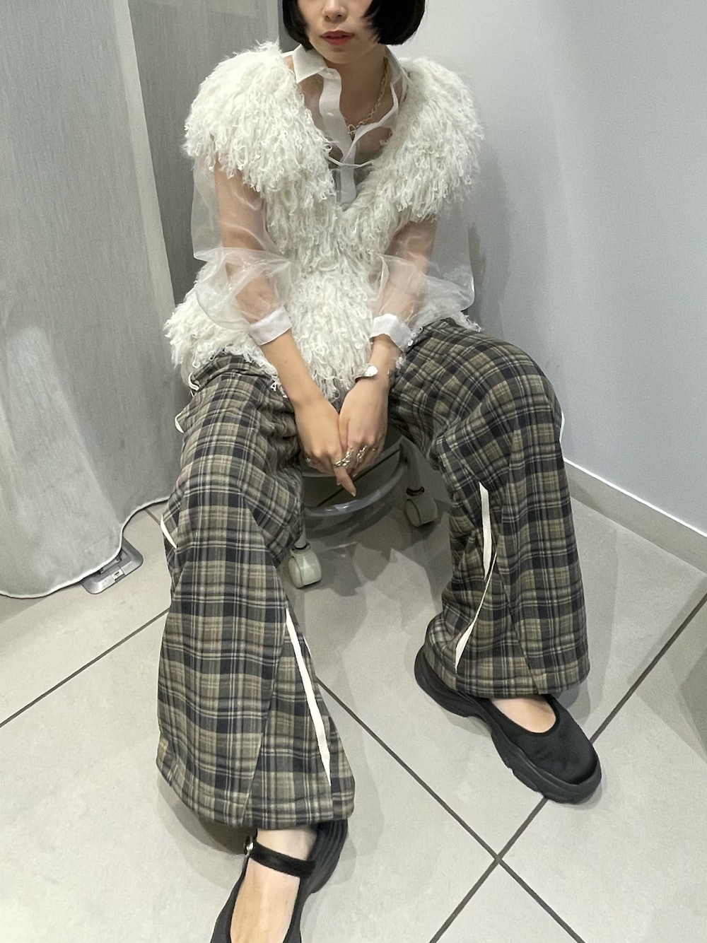 もえか / ecrumのベスト「Plenty loop リボンヤーンVネックベスト」を使ったコーディネート