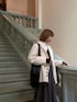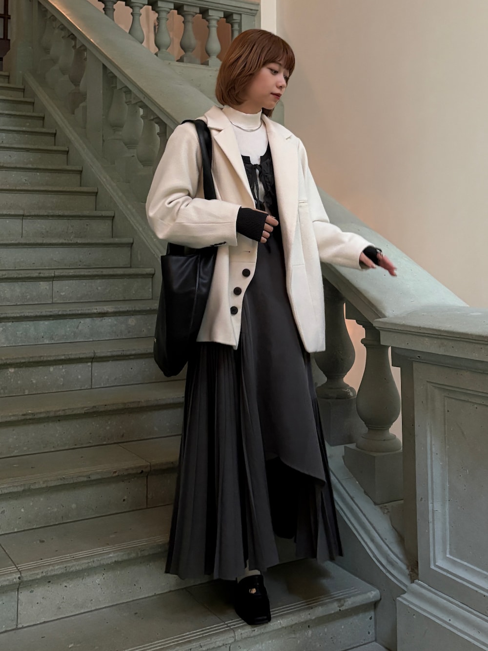 グレーでまとめあげた全体のトーンに、 白のクラシカルなジャケットを羽織ることで 上品な仕上がりに🍽
