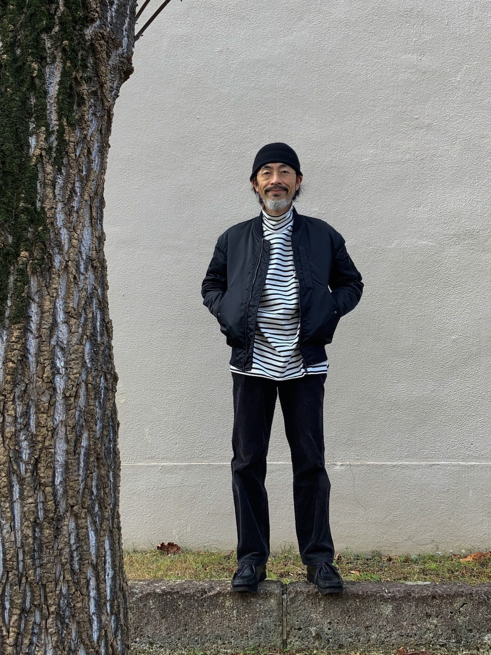 Khaki's Collection 2025 ニットキャップ → TOMORROWLAND BLACK 丸眼鏡 → ZParts Z-91 BG ジャケット → UNIQLO+J ハイブリッドダウンオーバーサイズMA-1ブルゾン 09 BLACK MEN XS モックネック → L'CHOPPE WIDE MOCK バスクシャツ BLACK M パンツ →UNIQLO U コーデュロイレギュラーフィットパンツ 09 DARK GRAY MEN 73 ベルト → BEAMS PLUS レザーメッシュベルト BLACK 30inch 靴下 → ユニクロ ソックス/チャンキー 57 OLIVE MEN 25-27 靴 → Clarks ワラビー BLACK UK6 1/2