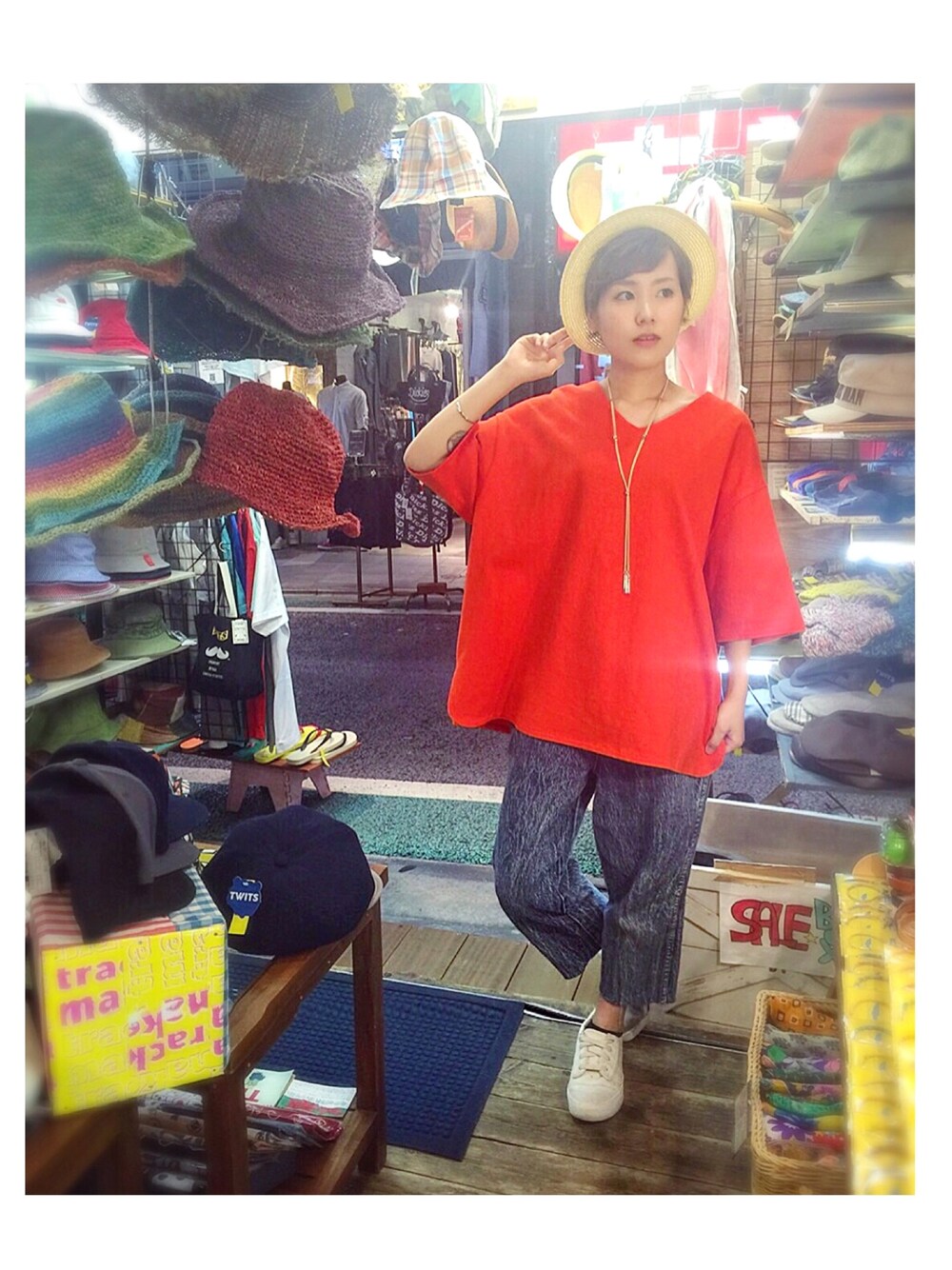今日はおにゅーのHAREビックVネックTでした😘 ビビットはトップスを大人っぽく着こなすのは今までなかったな〜! このトップスはスリットの前後の端の角の形が違うという、小さなところが可愛い❤︎ HAREのキレイめトップスと、自分でカットしたゆる〜い古着のパンツのコラボ。 ストローハットでクールに。 普段着ない色はテンションがあがりました😋