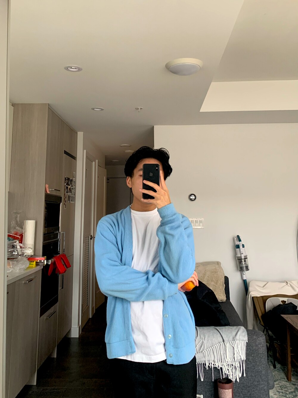 ホワイト系のトップスを着用したメンズの春コーディネートの1枚目の写真