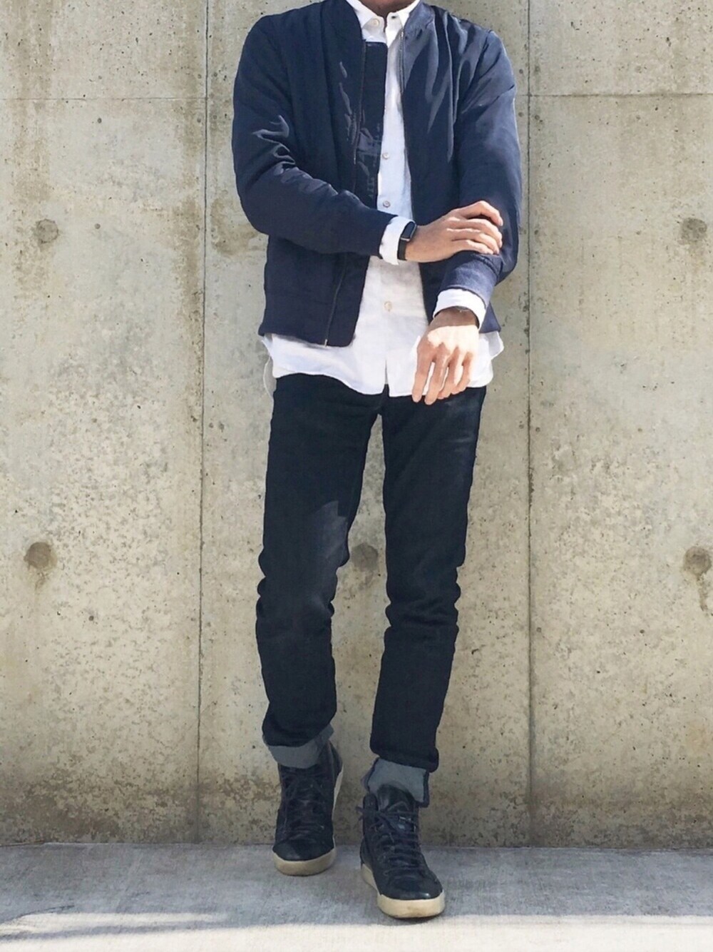ネイビーのナイロンジャケットとスキニーデニムでセットアップ風。インナーは白シャツにしてカジュアルになりすぎないようにしました。 袖からシャツ出すのもポイントです。