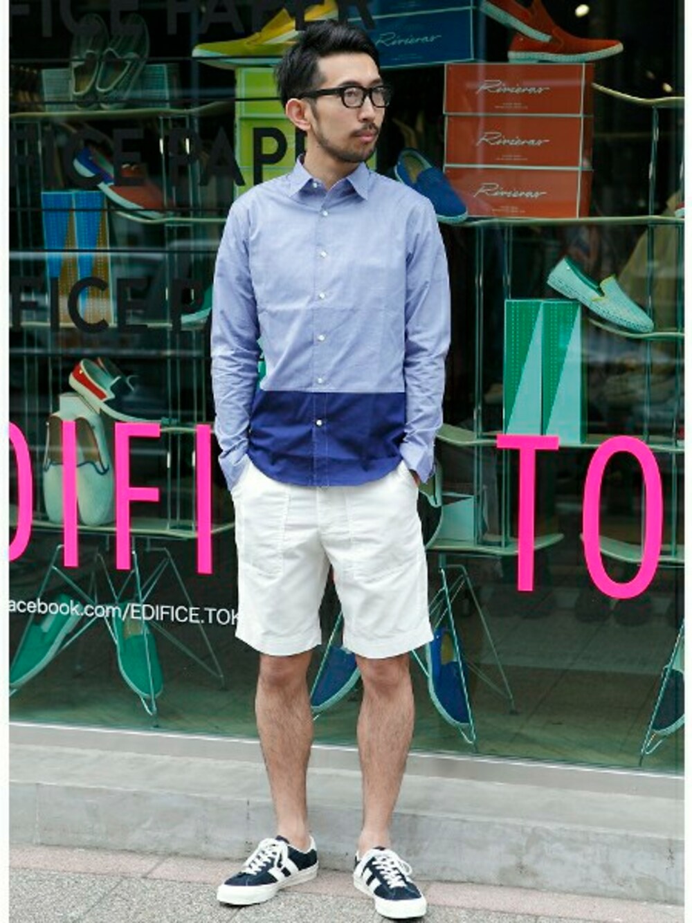 トレンドのバイカラーシャツは一枚での着用でもコーディネイトの感度を高めに見せてくれる役割があるので、シンプルに着こなすのがお勧めです。ホワイトとブルーのコントラストで爽やか印象に。