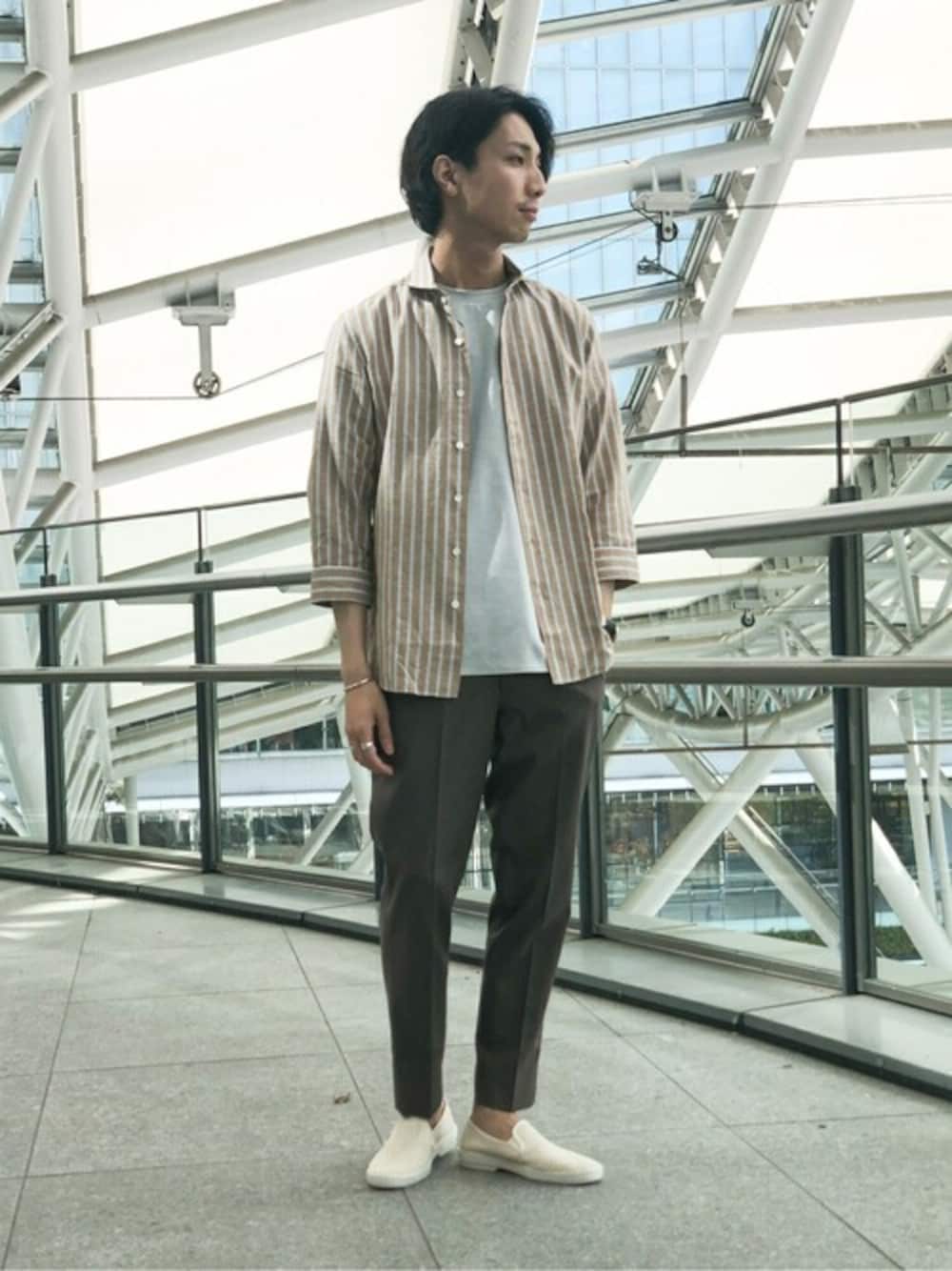 【コットン/リネン ストライプ 7分袖 カッタウェイカラー シャツ】 品のあるストライプが特徴的な7分丈シャツ。 インナーや足下に白を入れることでクリーンな印象のコーデにしました。 身長:173cm/普段サイズ:M/着用サイズ:M サイズ感:全体的に細身でスッキリとしたシルエット 素材感:程よく主張してくれるストライプが洒落感を出してくれる 着心地:サラッとしており快適な着心地