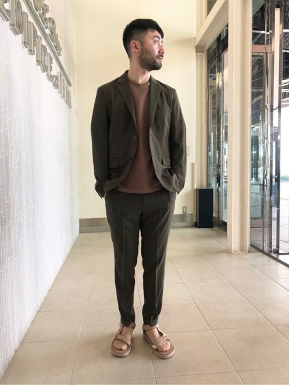 《CLICKライトメランジトロ 2ボタンジャケット》 ポリエステル素材を使用した一重仕立てのジャケット。非常に薄い生地感で、シワにも強く真夏も快適に着用できます。 ※共地でパンツもありますのでセットアップでの着用もお勧め。 カーキ、ベージュのアースカラーでコーディネートし、スポーティなリゾートスタイリングをイメージ。 身長 : 174センチ / 体型 : 細身 / 普段サイズ : M / 着用サイズ : M サイズ感 :Mサイズでジャスト 素材感 : 非常に薄いポリエステル生地 着心地 :伸縮性が高く、快適な着心地