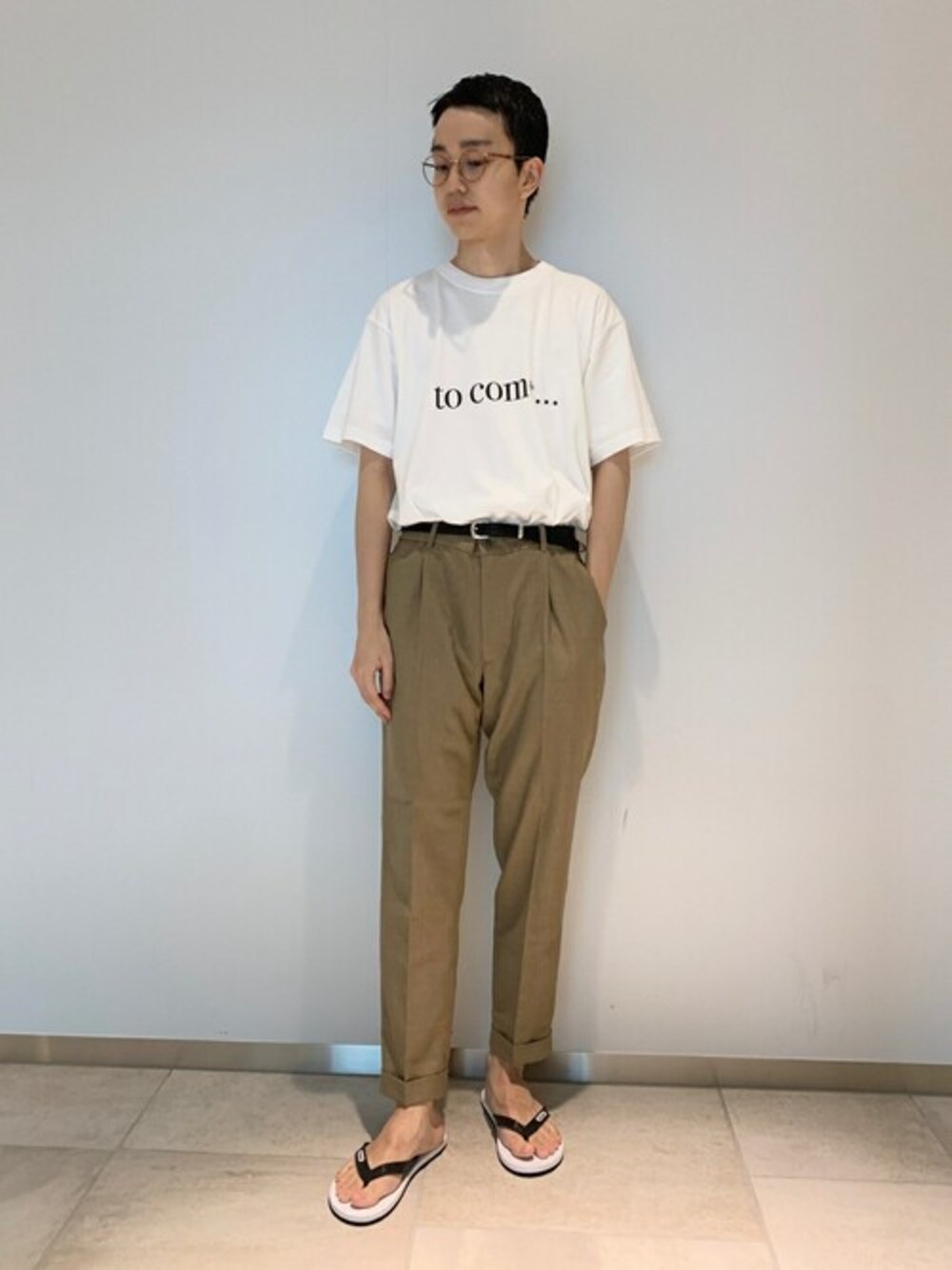 【PMD for LC to come】 Tシャツスタイルはキレイ目なパンツにタックインで人品なバランス感に。 身長:175センチ、痩せ型 / 普段サイズ:M/ 着用サイズ:L サイズ感:非常にゆったりしたリラックス感あるシルエット 素材感:上品な生地感 着心地:肌触りよく快適な着心地