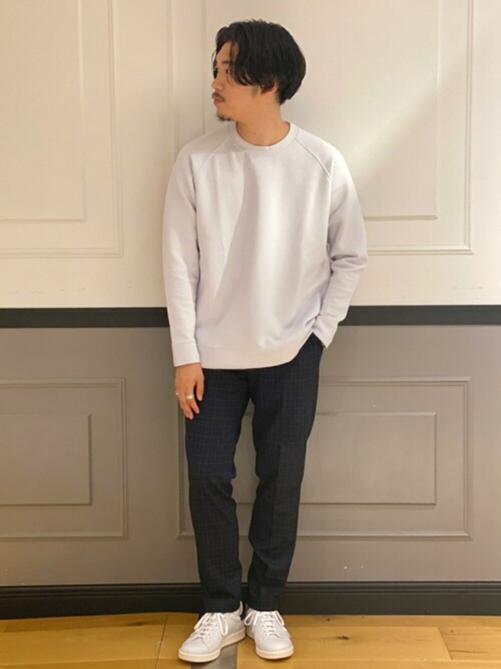 TRチェックイージーパンツ 定番のテーパードシルエットに別注のチェック柄を落とし込んだアイテム。サイドジップのスウェットとスニーカーで合わせスポーティーな印象に。 身長:173㎝/体型:がっちり体型/普段サイズ:L/着用サイズ:L サイズ感:テーパードシルエット 素材感:ハリのある生地感 着用感:腰回りにゆとり有り