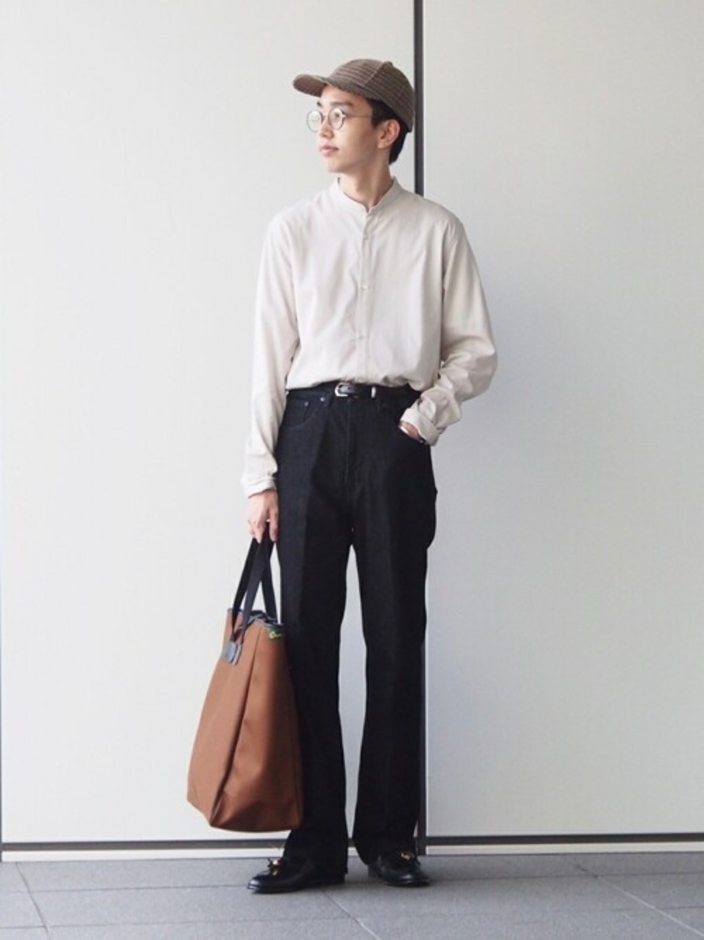 【ウォッシャブルバンドカラーシャツ】 ブラウン×ブラックで秋らしさを意識したスタイリング。 シャツはオフホワイトで柔らかさをプラス。 身長:175センチ、痩せ型 / 普段サイズ:M/ 着用サイズ:L サイズ感:スッキリとしたサイズ感 素材感:サラッとした肌触りの良い素材感 着心地:肌触りよく快適な着心地