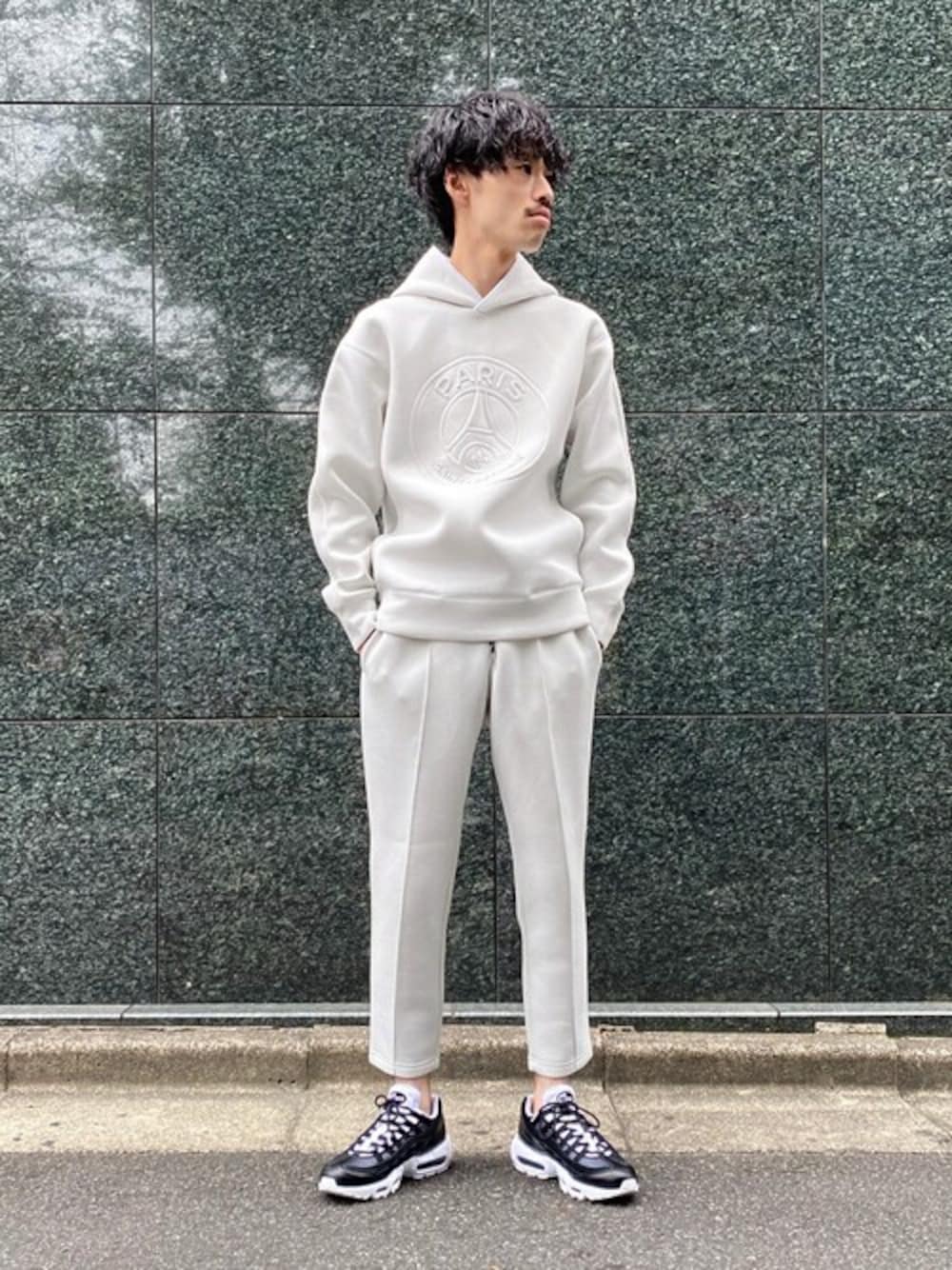 【Paris Saint-Germain】 ・LIGHT SWEAT Hoodie 毎シーズン絶大な人気を誇る定番アイテム。 デザイン性に加えて、ハイテク素材で快適な着心地。 ・HIP LOGO PRINT PANTS 上記パーカーと同素材のパンツ。 綺麗なテーパードシルエットで、美脚効果も。 身長:171cm / 普段サイズ:L / 着用サイズ:S サイズ感 : 普通 素材感 : 肉感とハリのある生地。 着心地 : 軽量で快適。