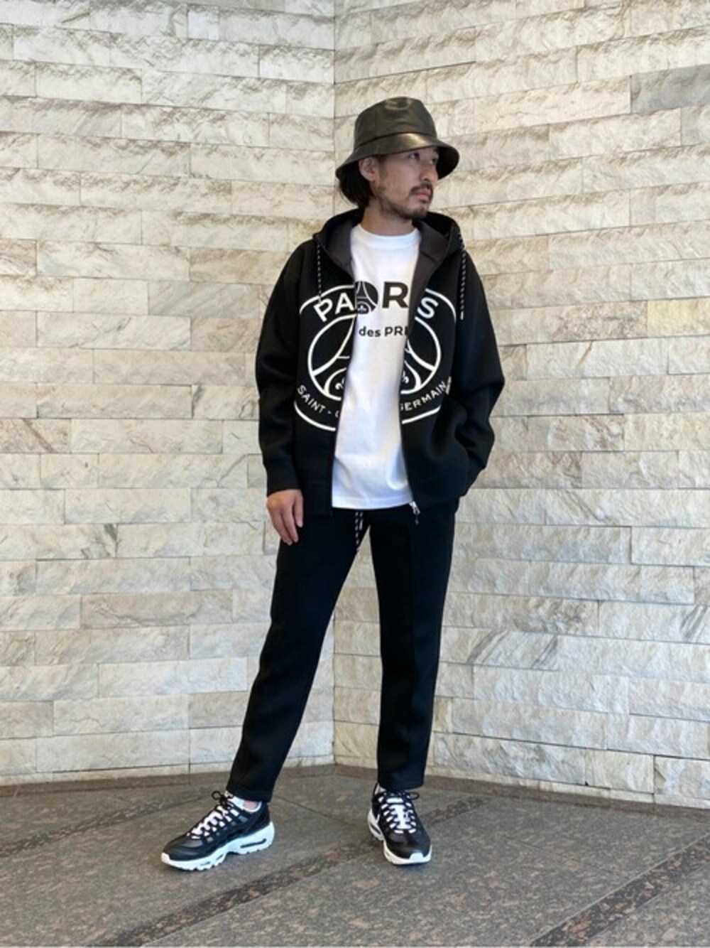 【Paris Saint-Germain】 ・LIGHT SWEAT Hoodie 毎シーズン絶大な人気を誇る定番アイテム。 デザイン性に加えて、ハイテク素材で快適な着心地。 ・HIP LOGO PRINT PANTS 上記パーカーと同素材のパンツ。 綺麗なテーパードシルエットで、美脚効果も。 身長:172cm / 普段サイズ:L / 着用サイズ:パーカーL、パンツM、TシャツXXL サイズ感 : 普通 素材感 : 肉感とハリのある生地。 着心地 : 軽量で快適。