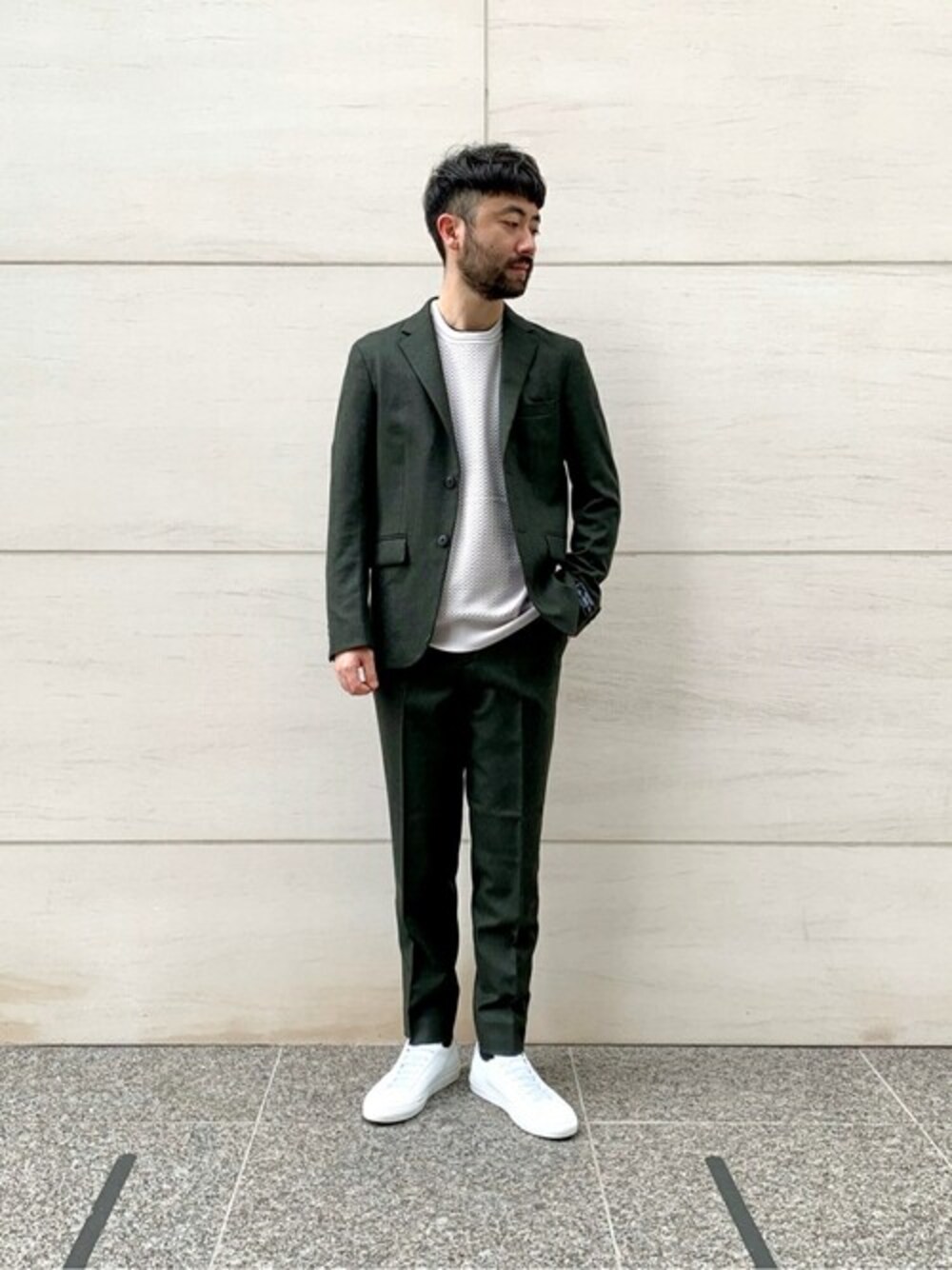 【TOP サキソニー セットアップ】 深い色味のカーキのセットアップに明るめのアイテムを取り入れ、軽快さを演出したコーディネート。 身長 : 174センチ / 体型 : 標準体型 / 普段サイズ : M / 着用サイズ : M サイズ感 : ジャストフィットの細身のシルエット 素材感 : メランジ調の上品な素材 着心地 :ストレッチもやや効いていて着やすい